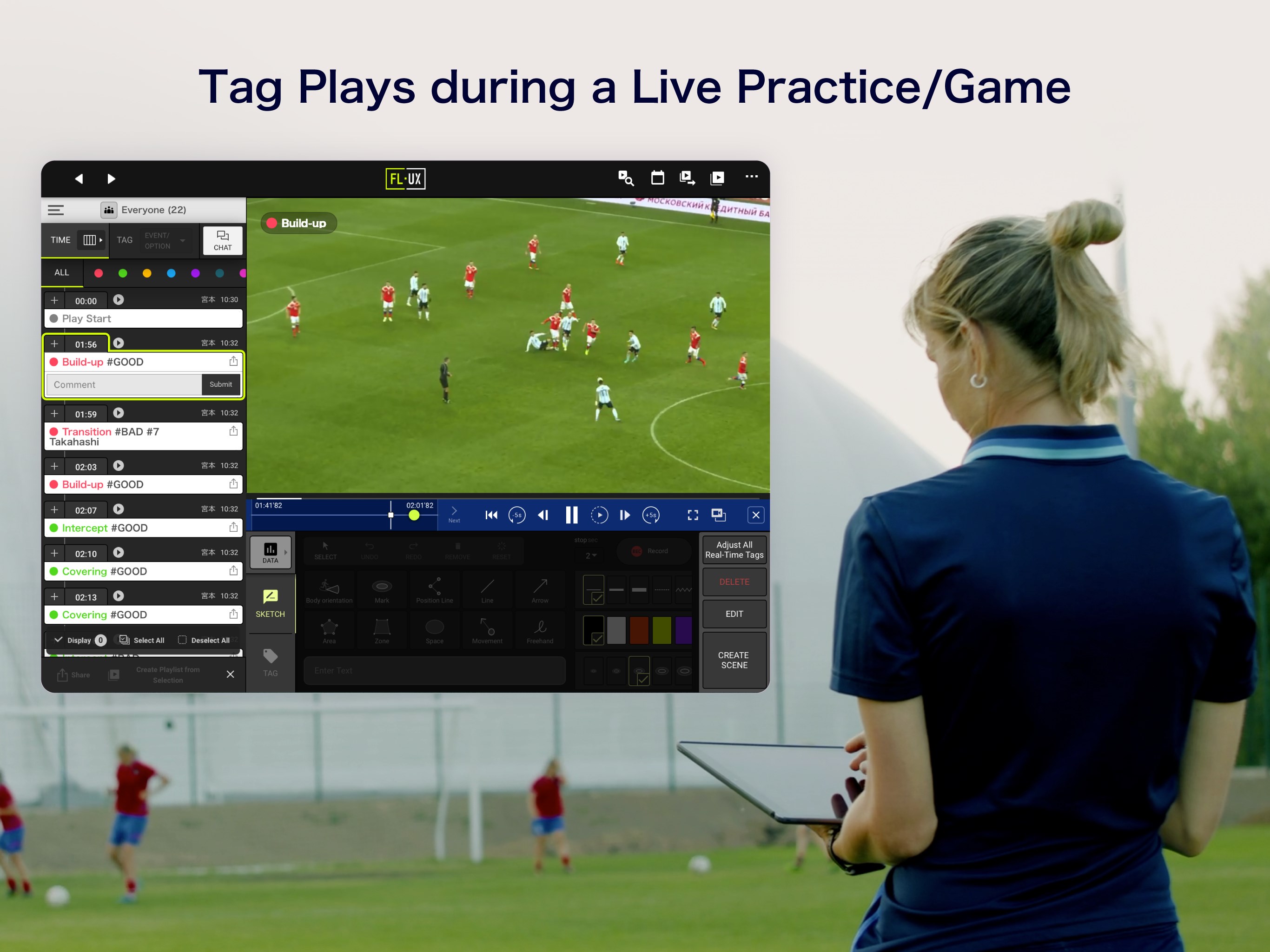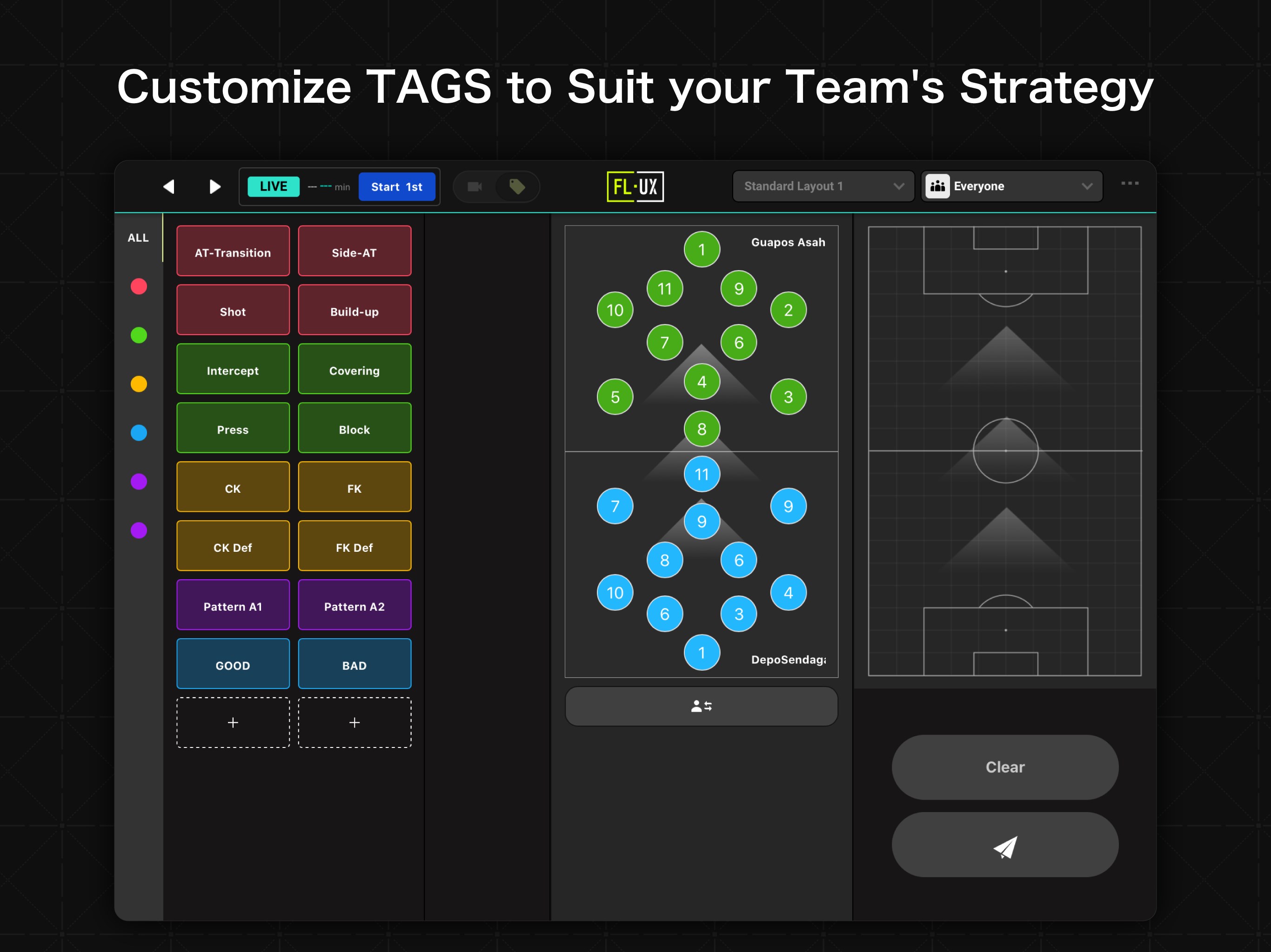 Upload your game videos to FL-UX and tag specific moments while watching (Video Tagging). Additionally, you can tag key scenes live during the match without losing focus on the players (Live Tagging). These tags are instantly accessible in the app, enabling real-time video-driven communication. You can fully customize the tags to fit your team’s strategy and training plan.