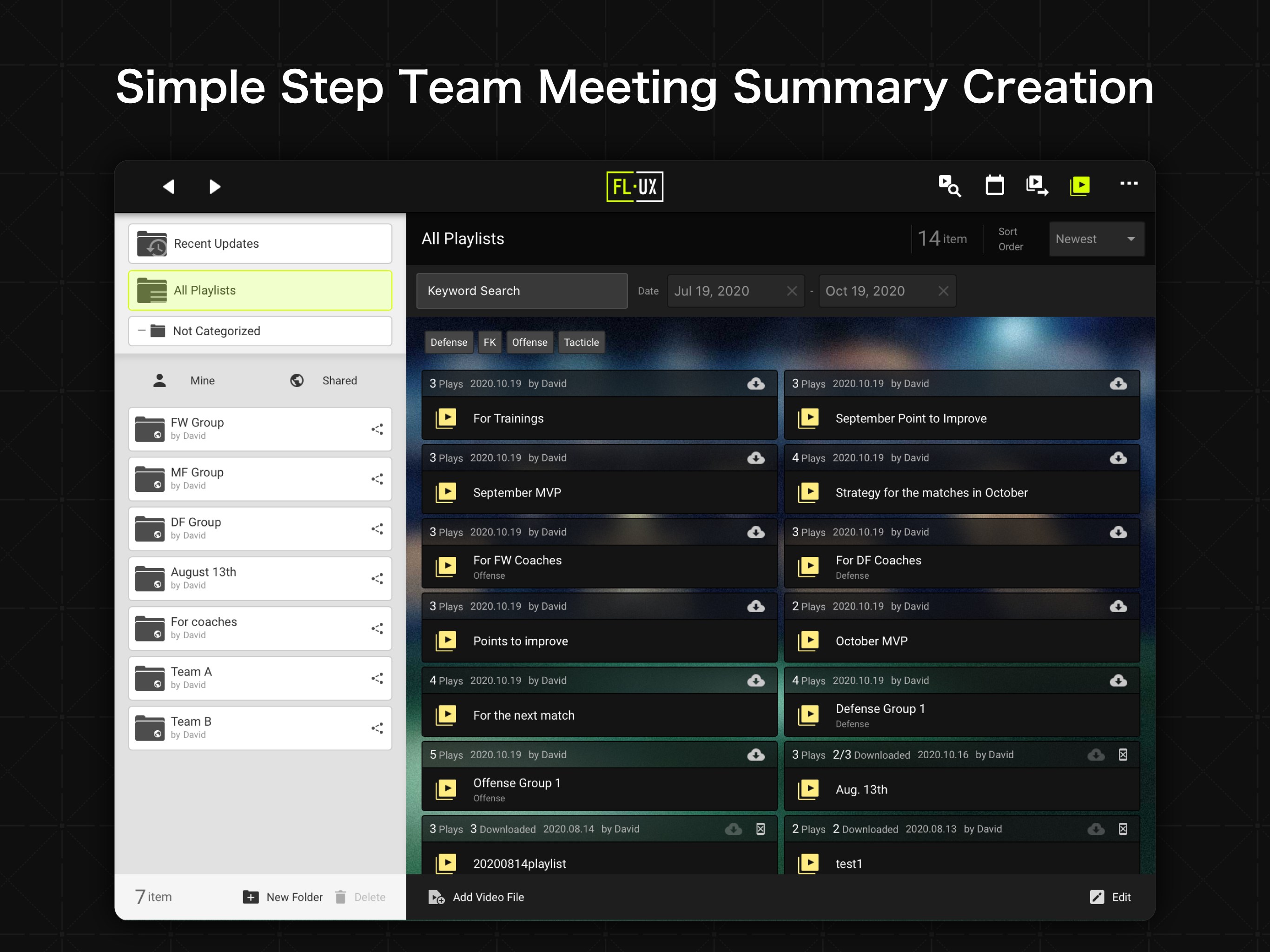 Manage all your game videos and scenes in one place. Create playlists from selected scenes and organize them into folders. You can share each playlist or folder with designated team members, making it easy to distribute targeted content. FL-UX also supports data-driven analysis by aggregating tag information for deeper insights.
