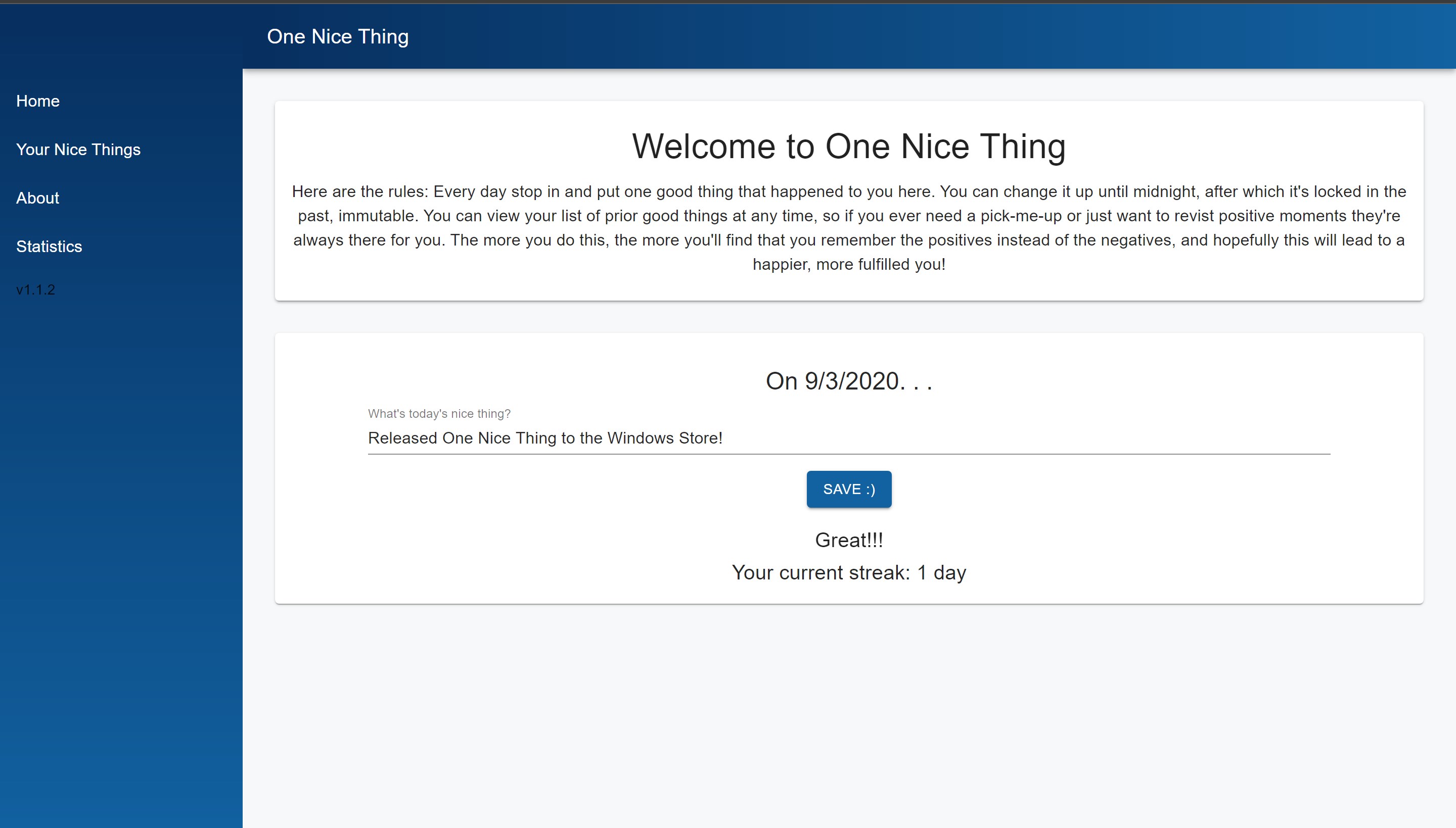 One Nice Thing is a simple application to help you focus on the good parts of life. The idea is simple: Each day you will fill add one nice thing that happened during the day, helping you look back and recognize that no matter how bad the day was there is always a silver lining. Once added those things are immutable. No matter what happens you can always rely on those notes being there for you to remind you that there have been good days in the past.