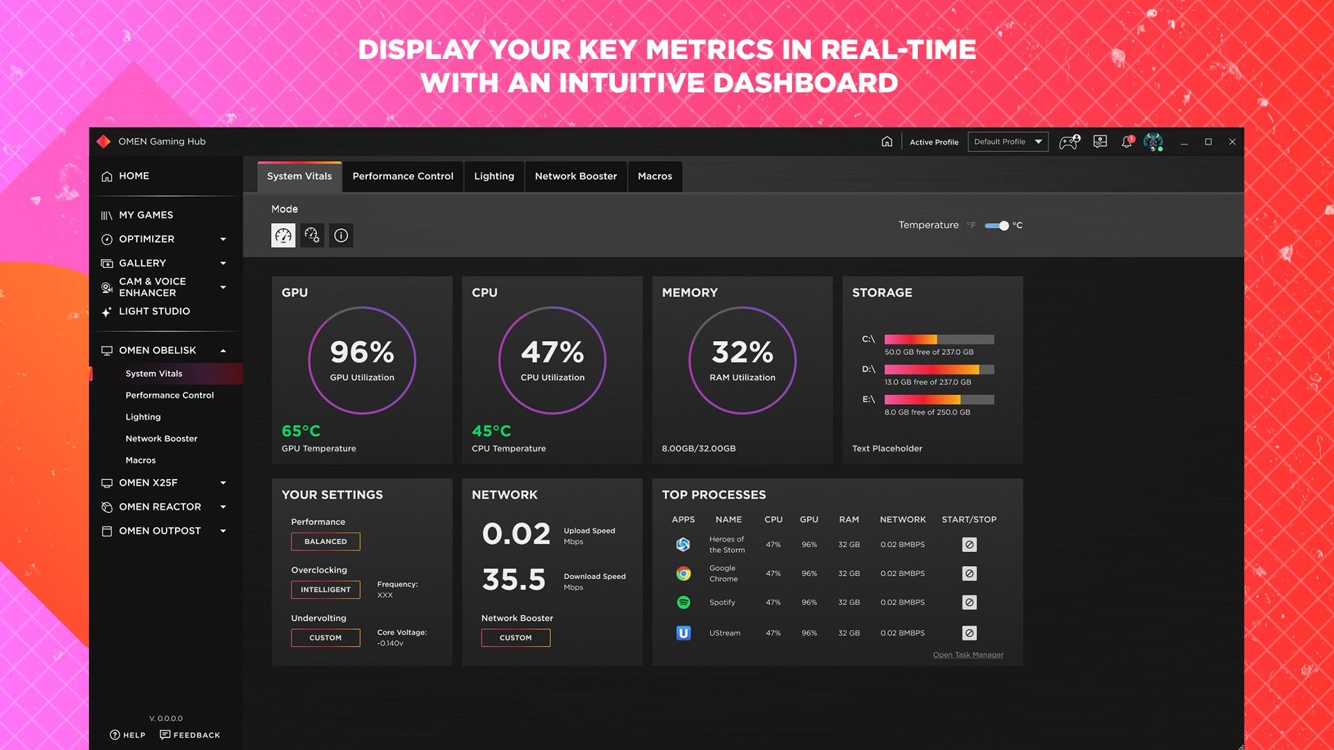 • System Vitals: Monitor CPU, GPU, and RAM utilizations, and network performance using a real-time dashboard