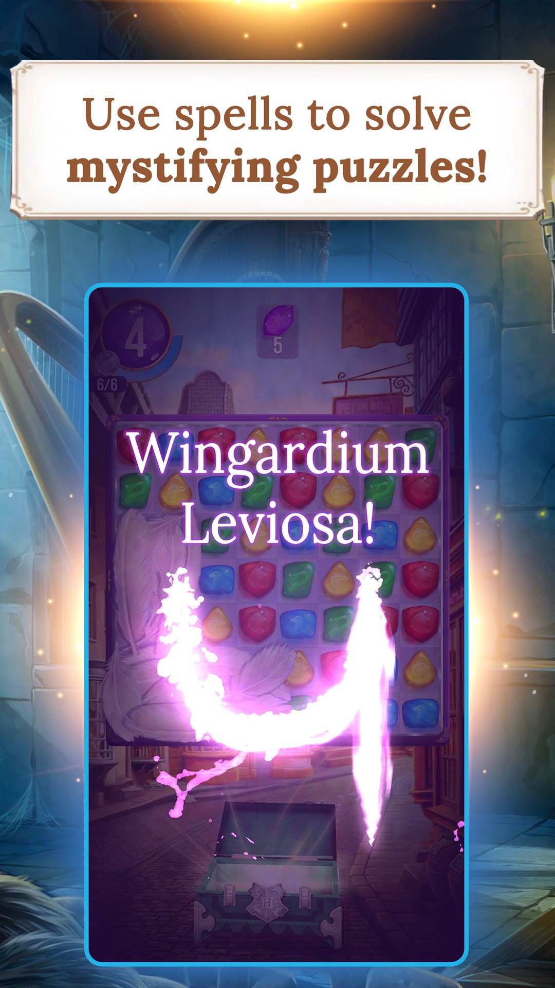 o Unlock & Upgrade Spells: Use Spells to beat Match-3 puzzles by obliterating obstacles and removing hazards. For example, cast Wingardium Leviosa to move objects out of your way.