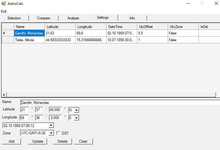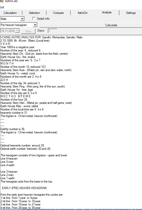 horoscope calculations (geocentric, heliocentric)tropical & sidereal zodiacprecise planets positions (elliptical, heliocentric, equatorial, filter by selected planet) astrological house calculation (including Placidus house system)astrological aspects – filter by typeset astrology text to aspects, sign & house position - manully edit, persist, export, importcompare horoscopes add, update, delete horoscopesprimary directions / mundane directions / zodiac directionstransistions (planetary directions)solar / moon revolutionssecondary directions / progressionscalculate conception horoscopesolar / moon eclipses / planets rise / set biorithm calculations - physical, emotional and mental cycles, calculation starting biological year moon calendar with text description for every dayi-ching astrology - year, week and day calculations (hexagrams, trigrams)vedic astrology - Tithis, yogas, nakshatras, tatwas...i-ching numerology, early and later heaven tigram