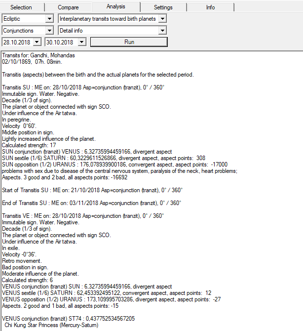 - Transits analysis against planets and houses of selected date (planets & fixed stars transitions)