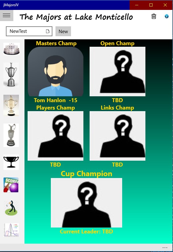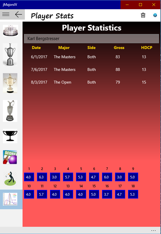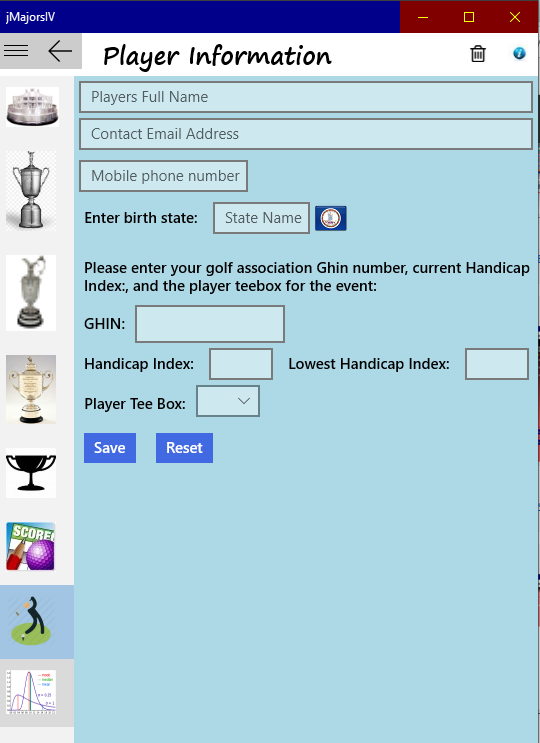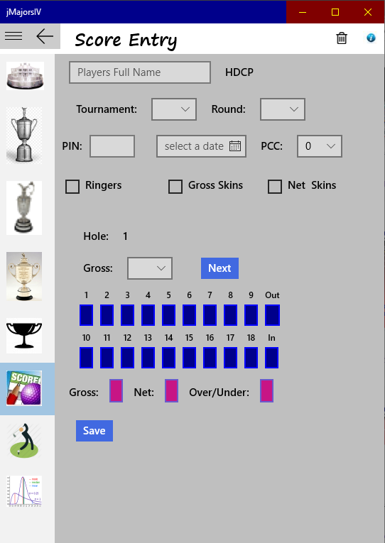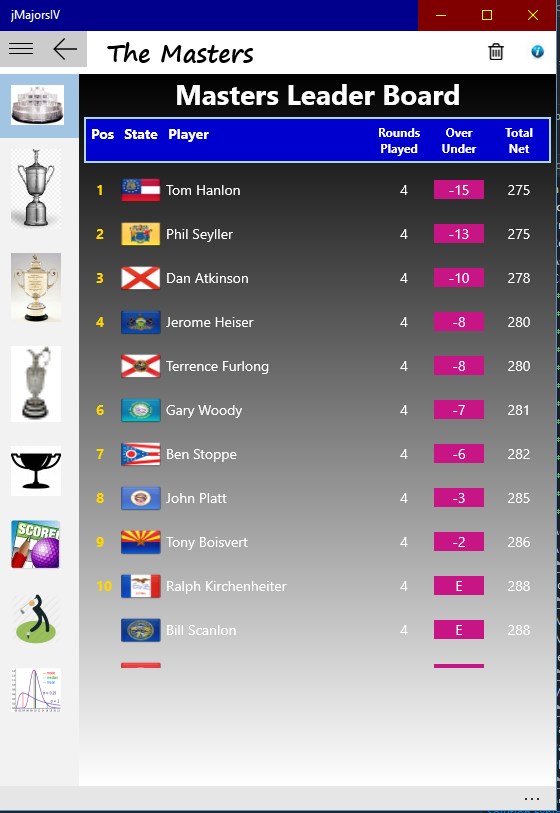 The jMajorsIV application provides golf score data management for 9 or 18 hole competition golf in a format similar to a competitive PGA tournament. The tournaments in the application are aptly named for the four major PGA events: The Masters, The US Open, The PGA, and The British Open. Each major tourney consists of four rounds. Scoring is based on net score using a progressive handicap index calculation that follows USGA methodology. After each round a new handicap index is determined for the players next round. The handicap calculated is course specific. and after the first round, does not rely on the handicap index calculated by the USGA. Player standings at the end of each major tournament are awarded Cup Points which can be used to award a Cup Champion or as a basis for participation in a Cup Championship supported by the application.