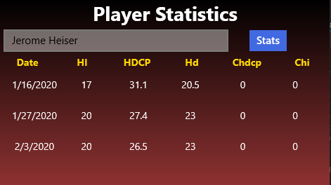 Scoring can be entered by the individual player or by a designee, and consists of the gross score for each hole. Equitable score control is used based on the players handicap index to adjust gross score entries for net score determination. As each hole score is entered, handicap dots, the gross score for each nine, the total gross and net score, and over-under par score are displayed. Leader score boards automatically update as the completed score for each round is entered. Player statistics are tabulated and displayed for each tournament round and for each hole.