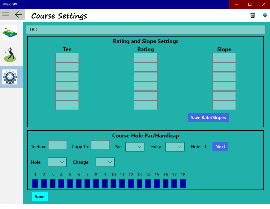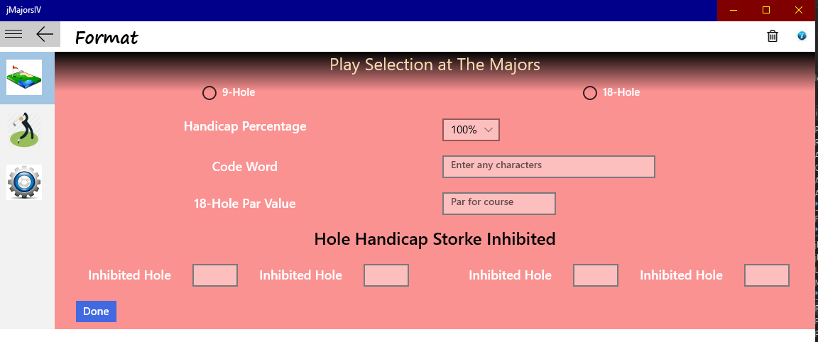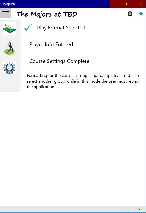 Users are required to select a Group name that will serve as the directory in which data is stored. Each time the application is opened, the user must select a directory or create a new directroy. After creating a Group name, the user is presented with a setup page to allow course data settings to be entered. Type of players competing(seniors, women, mixed, men's), course tee slope and ratings, tee par per hole, tee hole handicap per hole, along with the course name and code word can be entered. The code word selected allows application management to bypass player verification when entering scoring or player information. The setup page statuses initial player entry but does not require all players to be entered; players can join as the competition ensues throughout the event. Play format (9 or 18 hole) is also selected for the competition and a selection for the handicap percentage (50, 60, 70 ,80, 90 or 100) to be used for net scoring.