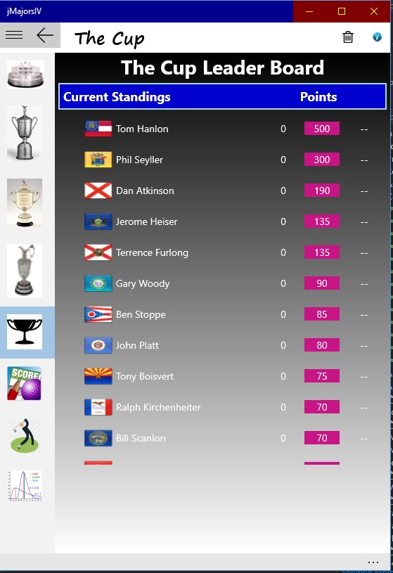 Viewer: For large organizations, players can download jMajorsViewer from the Microsoft App Store for displaying leader boards, cup points, player contact information, and individual statistics. Requires the manager of the jMajorsIV app to email the groups data files to the user. See jMajorsViewer for more information and download instructions.