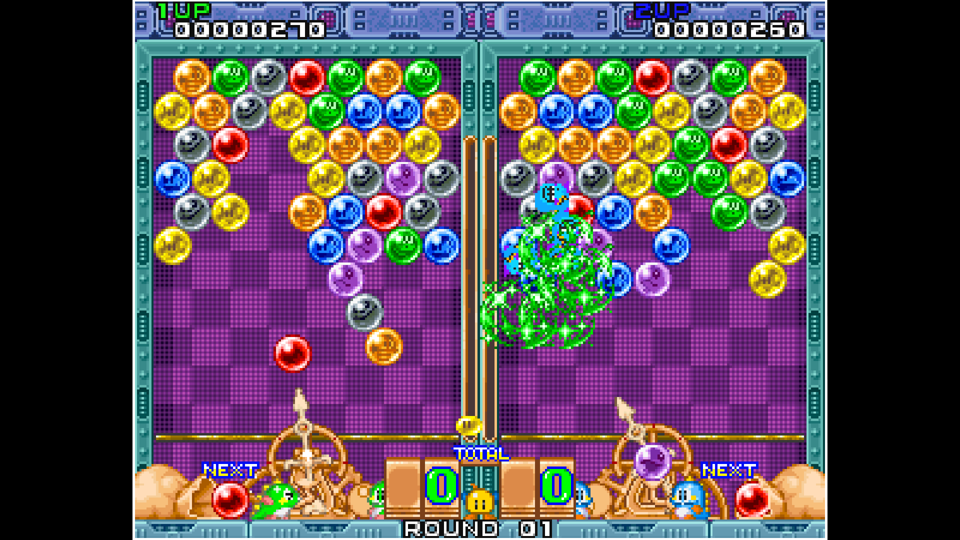 Bub and Bob, the bubble spitting dragons from the action game, BUBBLE BOBBLE, are back in a new bubble-based puzzle!