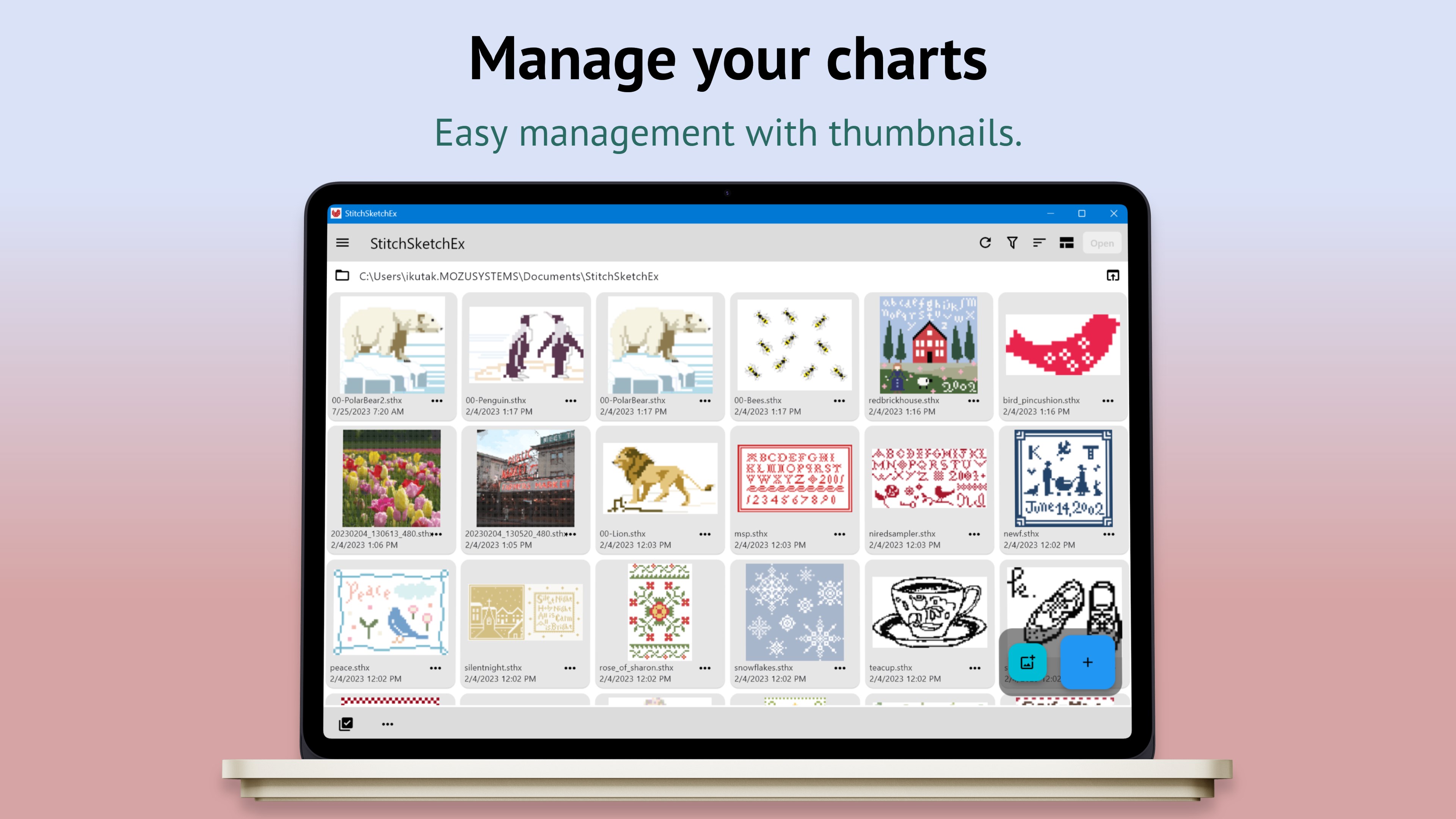 - Can load legacy files including KG-Chart (sth/sthbw) and StitchSKetch (sthmb).