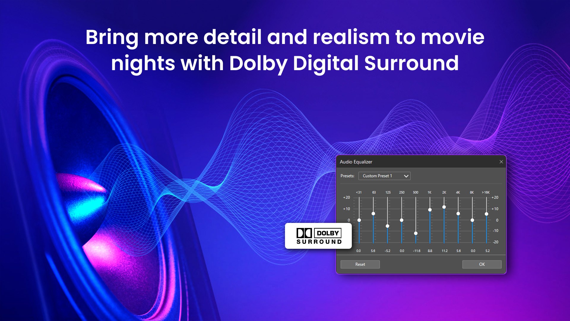 TrueTheater Sound® Creates a fuller audio environment by enhancing bass, vocal range, reverb, and volume.