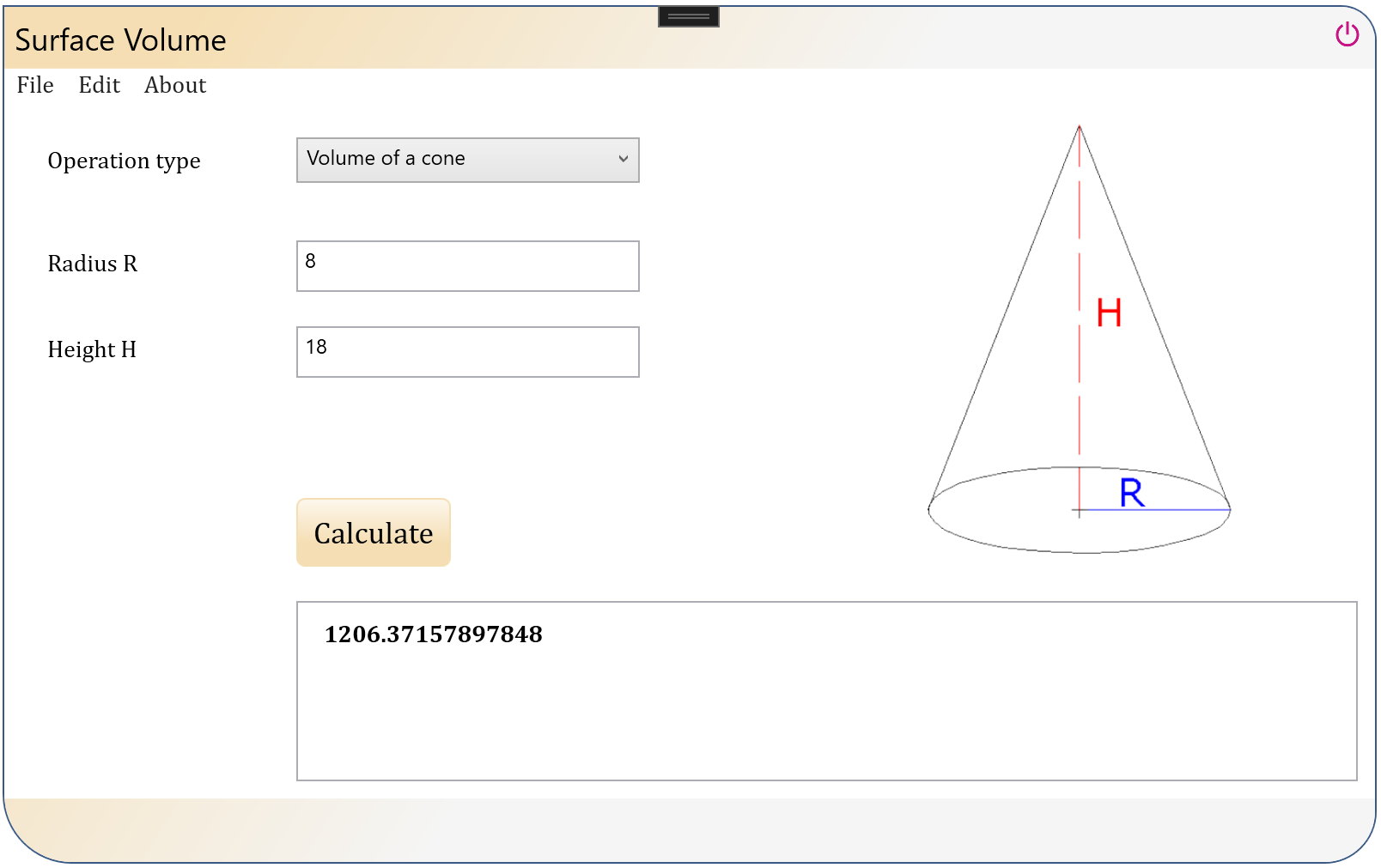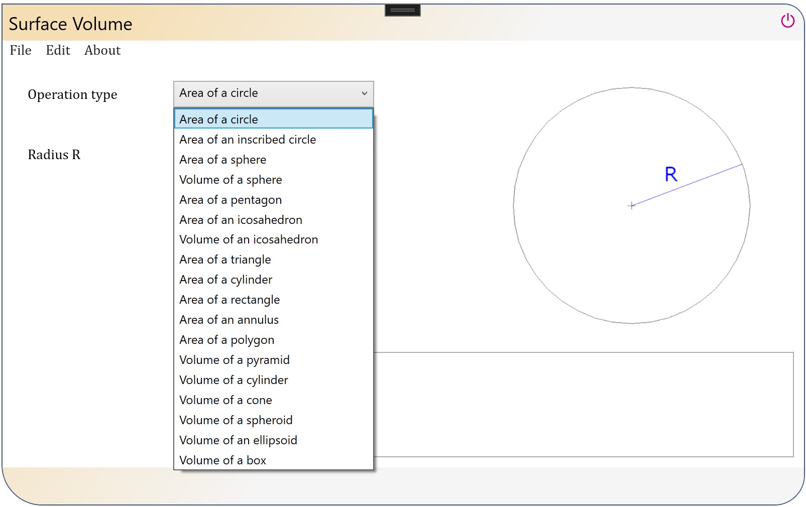 Surface Volume is an application that permits to calculate the areas and volumes of geometric figures like circle, sphere, rectangle, triangle, pyramid, pentagon, icosahedron, cone, cylinder, box ellipsoid of revolution (spheroid), and 3 axes ellipsoid.