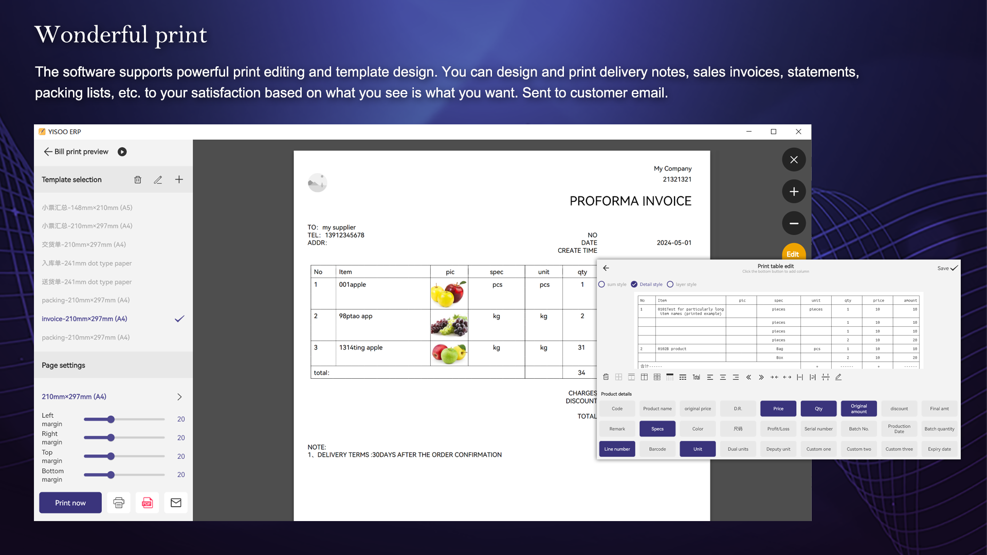 2. Dot-type printing of multi-link delivery notes, sales orders, Bluetooth printing of receipts, product tag label printing, and the printing content can be edited at will.