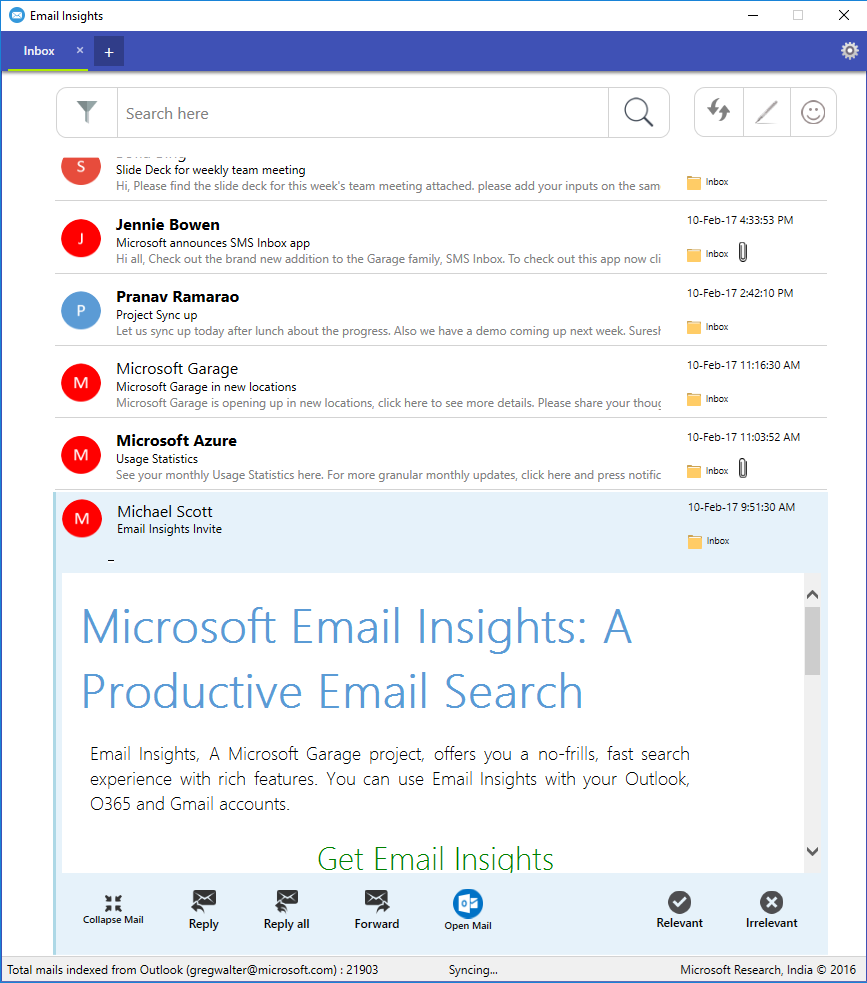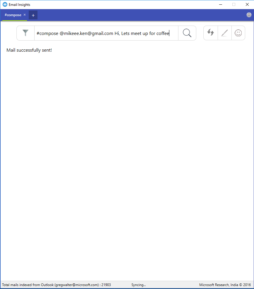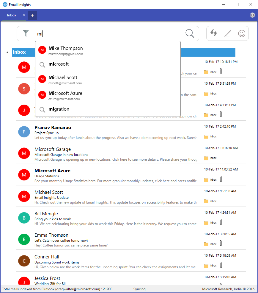 Email Insights is a lightweight email search client which helps users do their emails related tasks faster. It provides guided search in the form of superfast autocomplete, spell correct and fuzzy name search which means that users do not have to type out everything. Email Insights provides relevance based search results in addition to time ordered results so that users do not have to scroll down to find that elusive mail. Email Insights also provides additional features like tabbed email searches and quick commands from search box so that your email experience is faster, easier and more productive.