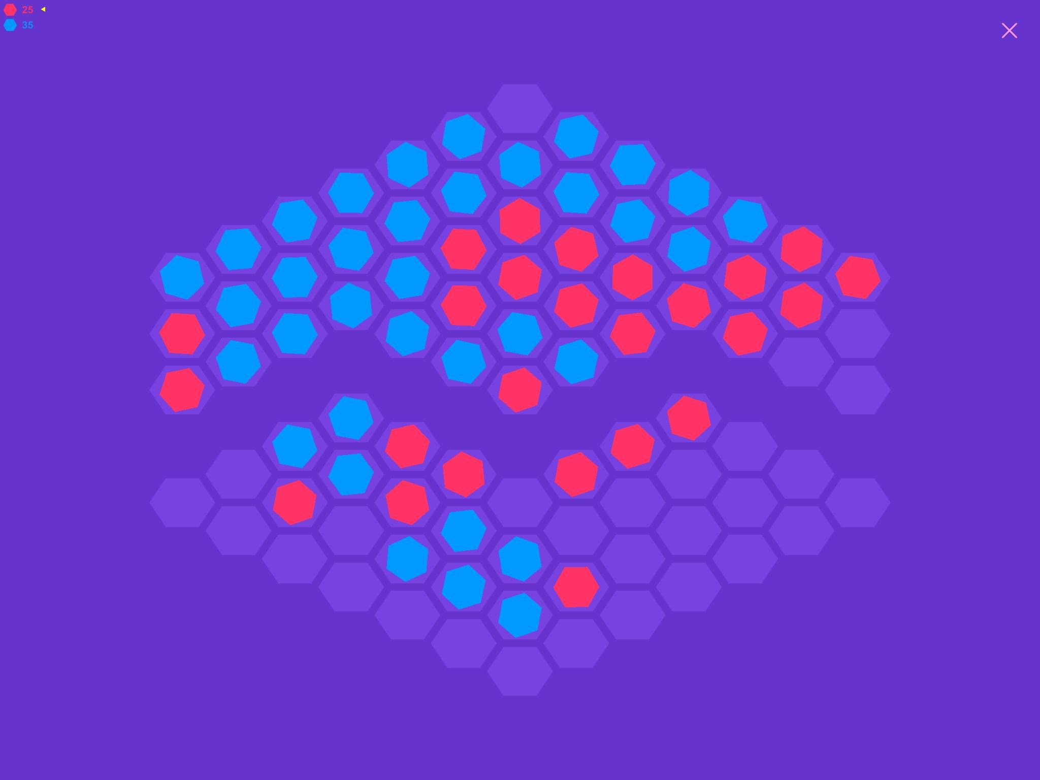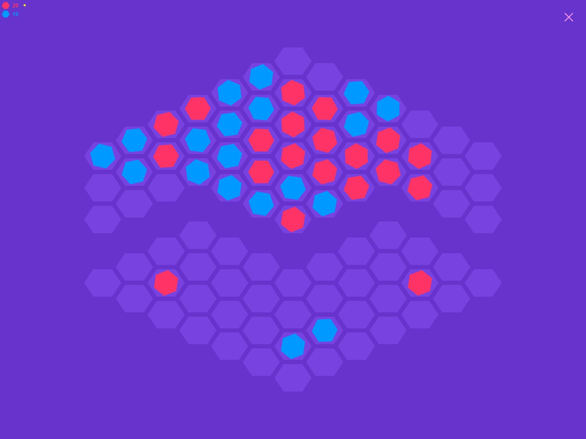 The red and blue sides battle, starting with the red side, in an array of hexagons. Click on the red pieces appear available mobile locations, there are green and yellow areas, click on the green position, the pieces will be copied to the click position, the number of pieces plus 1, if you click on the yellow position, the pieces will jump to this position, the number of pieces will remain unchanged.