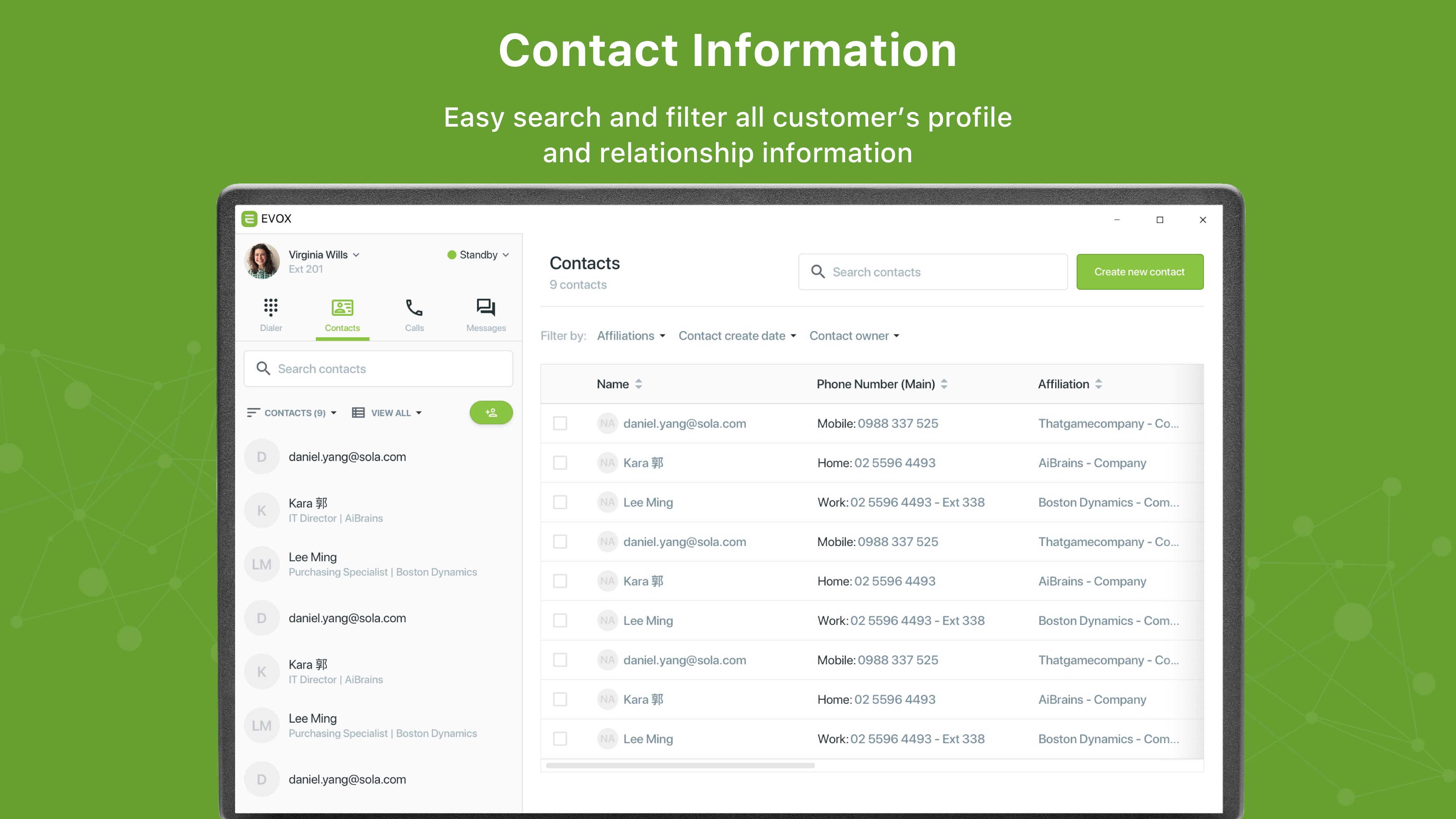 - Easily reach your team members or customers using the contact list