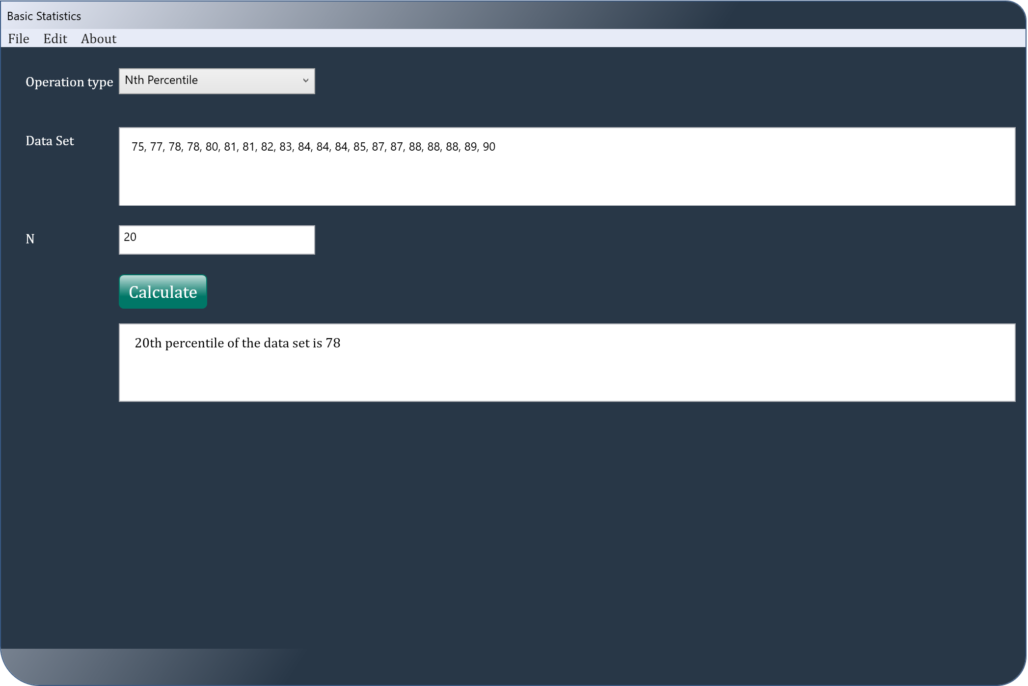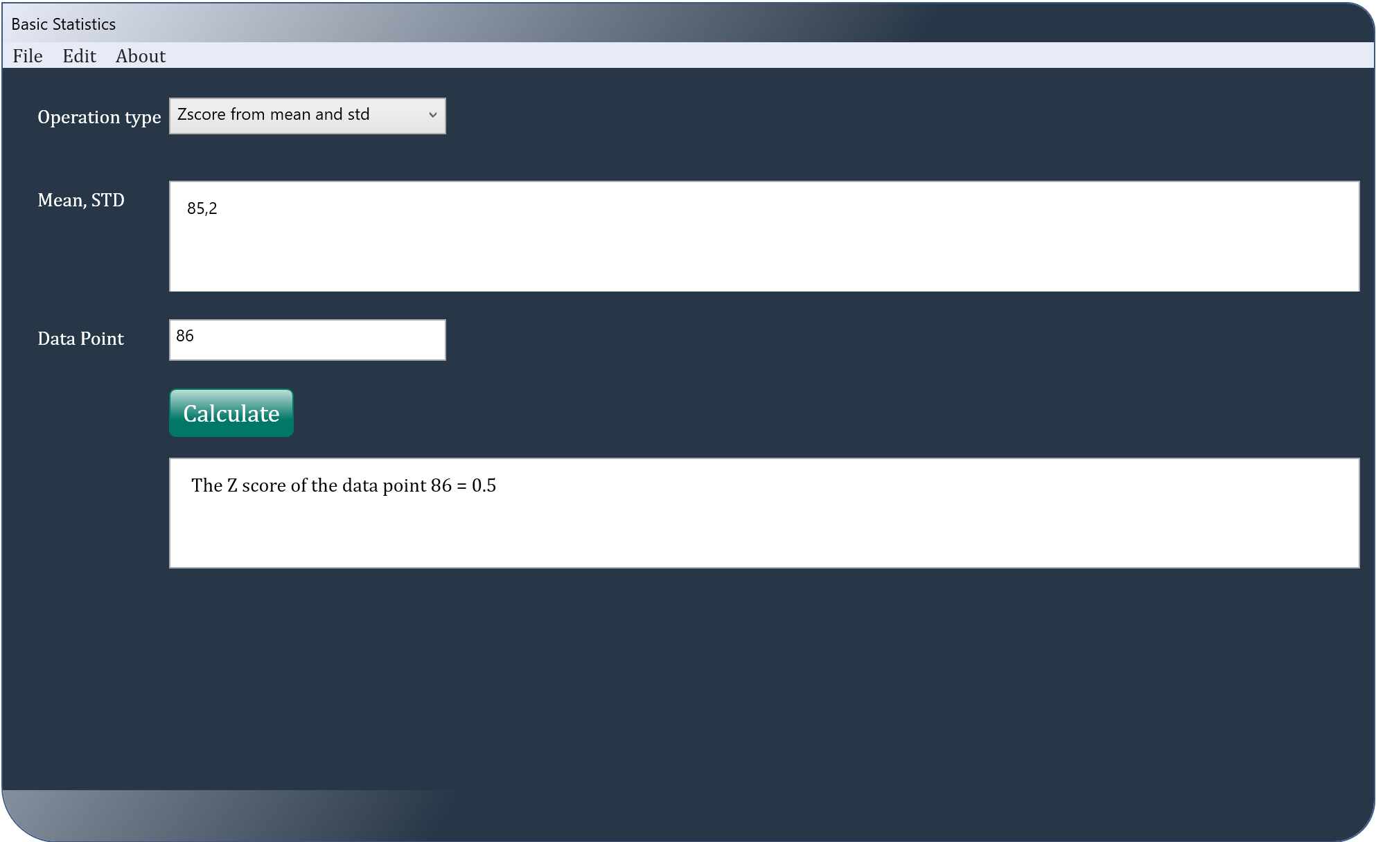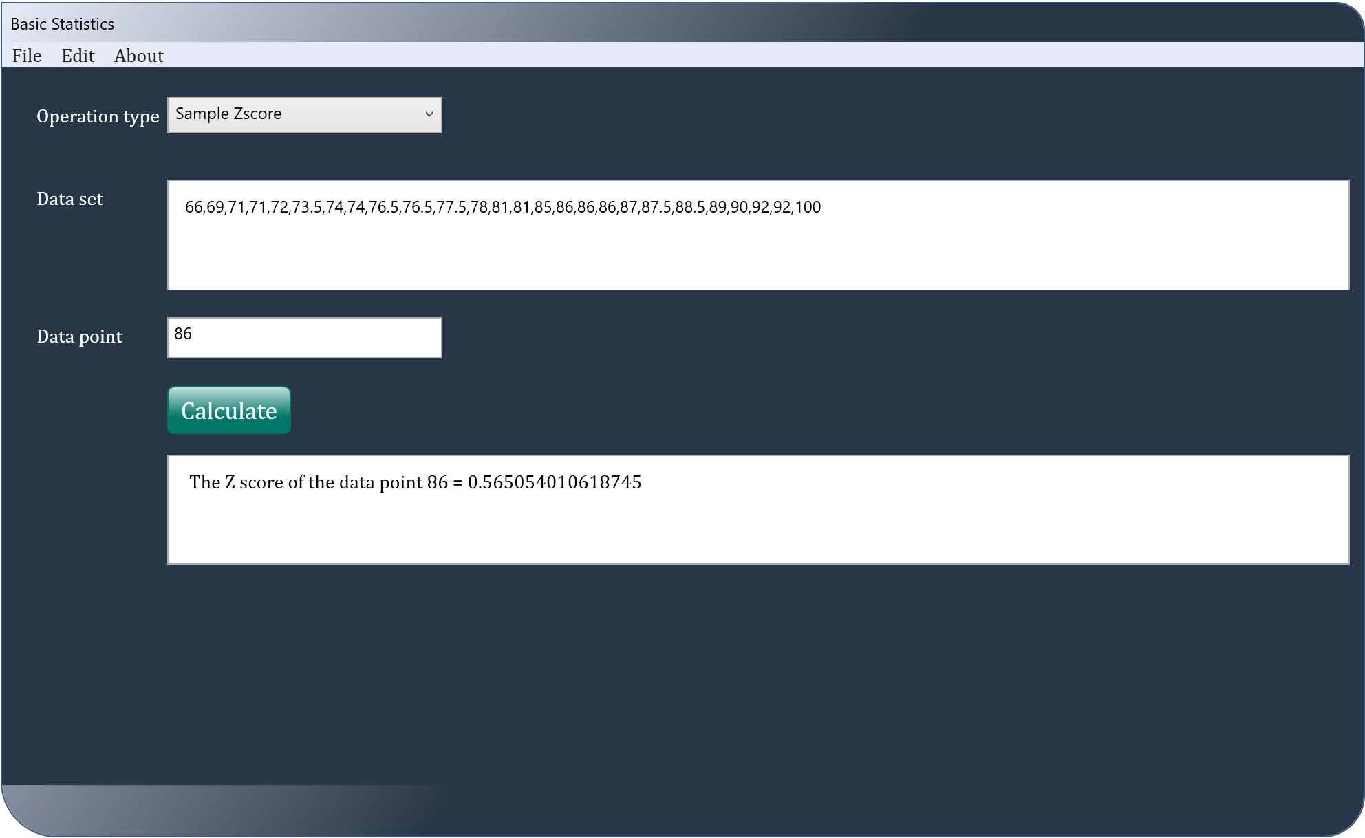 College Statistics is an application dealing with the core concepts of statistics such as the mean, mode, median, variance, standard deviation, nth percentile and Zscore of a data point in a population, Zscore of a data point in a sample and Zscore from the mean and the standard deviation. All the user of this app has to do, is to type in or paste the dataset and hit a "calculate" button.
