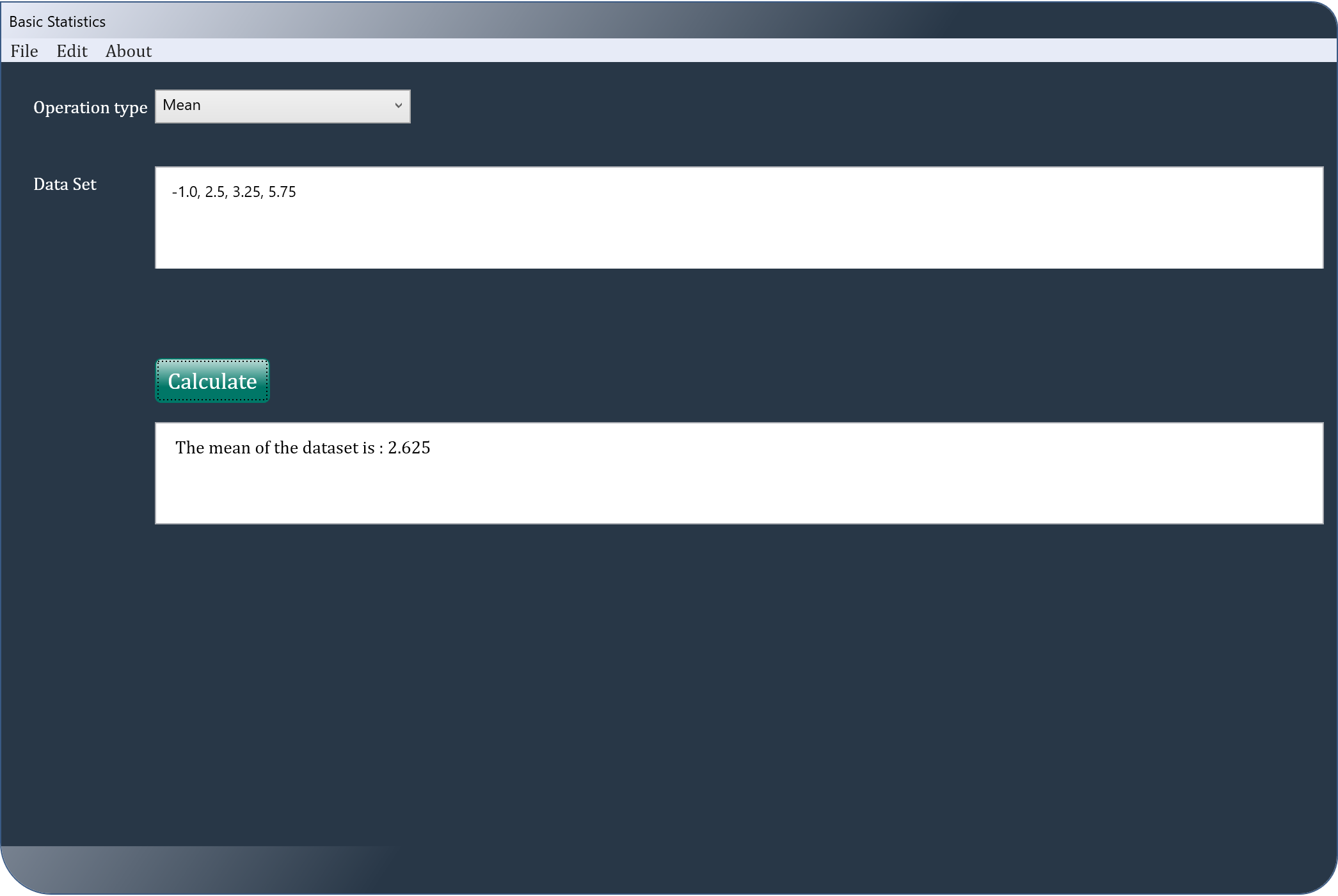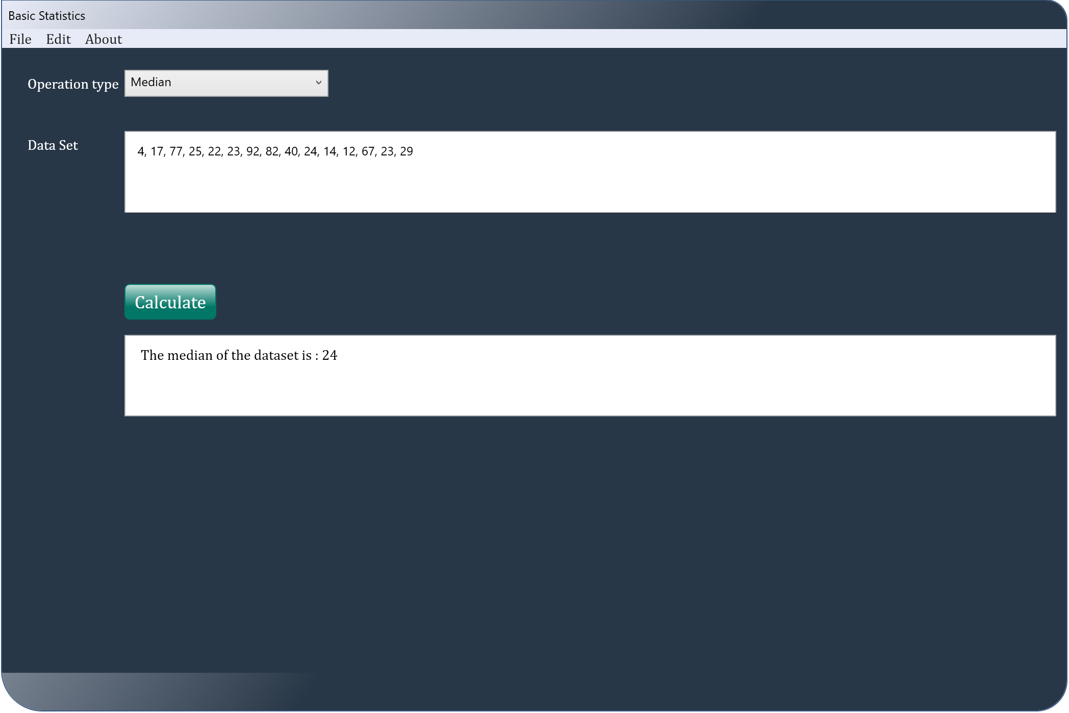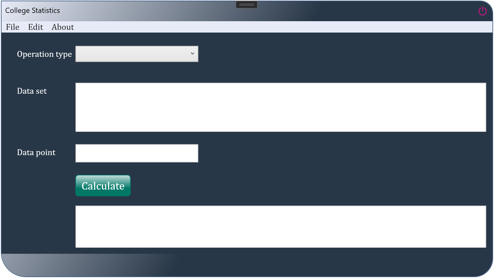 College Statistics is an application dealing with the core concepts of statistics such as the mean, mode, median, variance, standard deviation, nth percentile and Zscore of a data point in a population, Zscore of a data point in a sample and Zscore from the mean and the standard deviation. All the user of this app has to do, is to type in or paste the dataset and hit a "calculate" button.