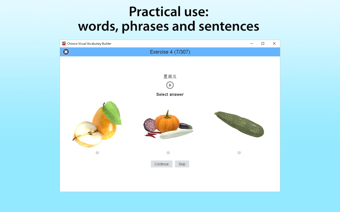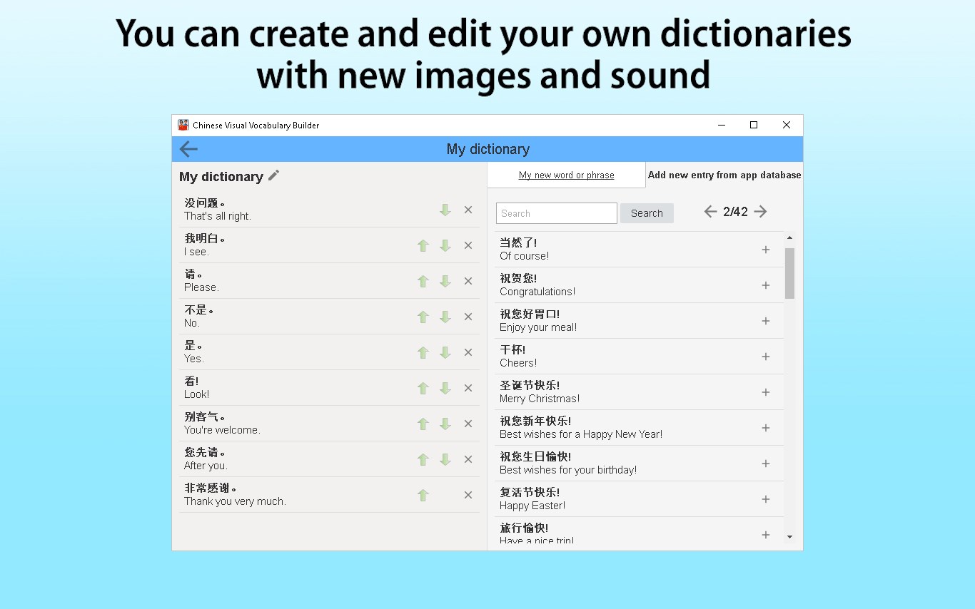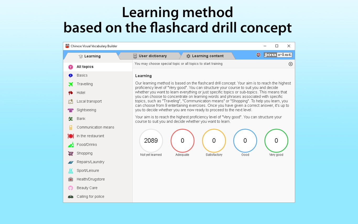 Thanks to our unique learning method, you will soon achieve great results on the path to mastering Chinese. Vocabulary Builder is ideal for anyone wishing to learn some words and phrases for use on holiday, as well as those looking to brush up their language skills.