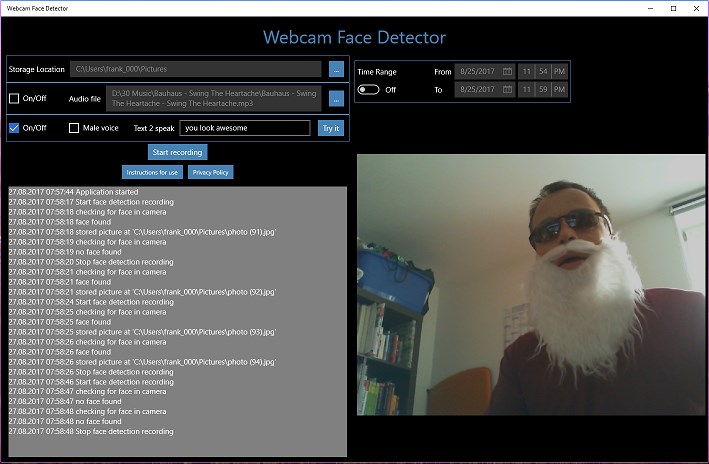 Detect faces in the webcamRecord picturesPlay audio fileSpeak an entered textSchedule recording
