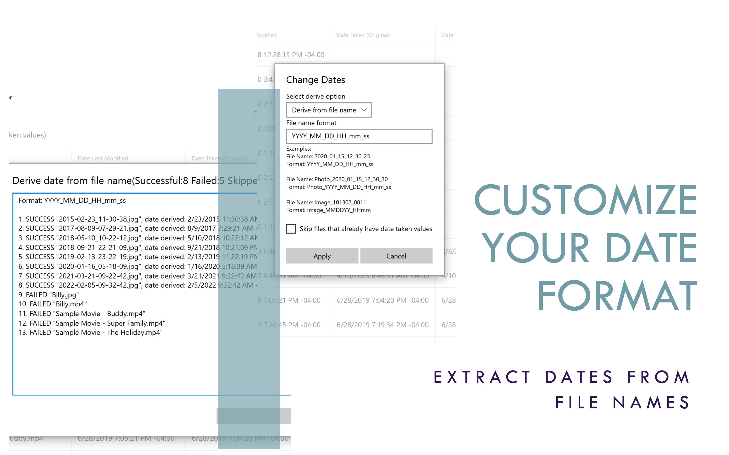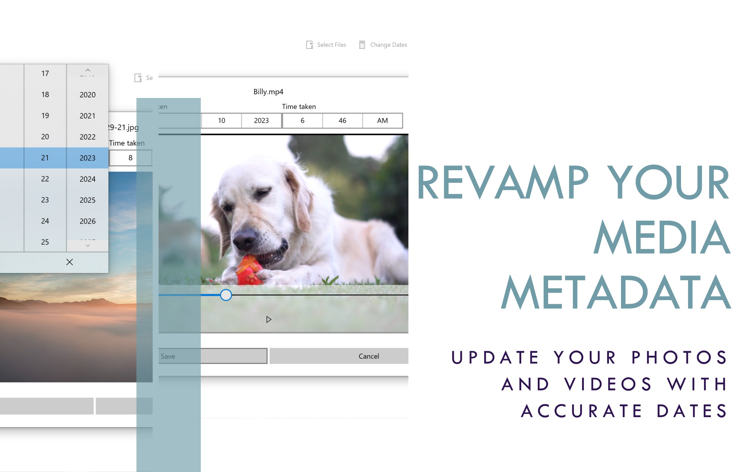 Update incorrect dates for photo and video filesChange date and time taken for image files in bulkChange media creation date for video files in bulkDerive date values from file namesDerive date taken values from file last modified dateCompatible image input file formats: JPEG, JPG, PNG and HEICCompatible video input file format: MP4Image conversion from PNG to JPG formatImage conversion from HEIC to JPG formatDerives dates from Ring videos