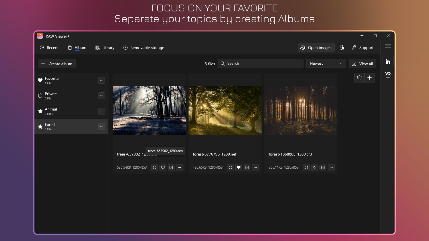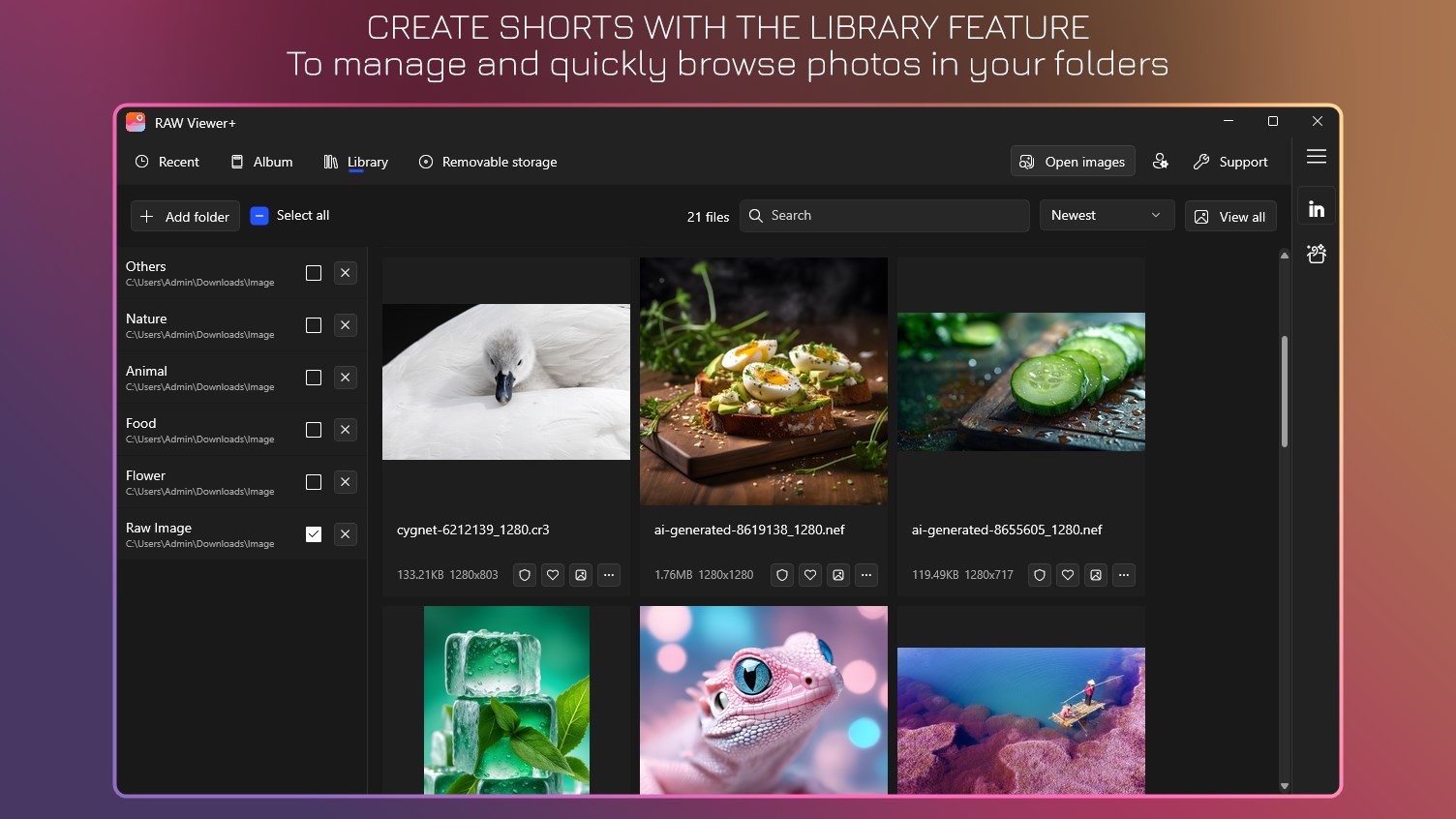 + Quickly view ARW, CR2, NEF, DCR, DNG, ERF, MEF, ORF, PEF, RAF, RAW, RW2,