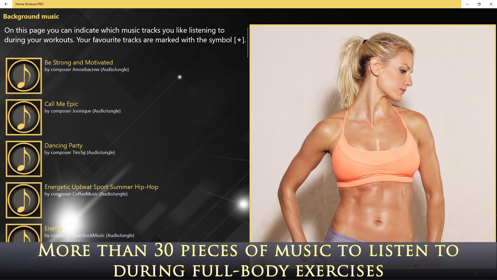 - More than 30 pieces of music to listen to during full-body exercises