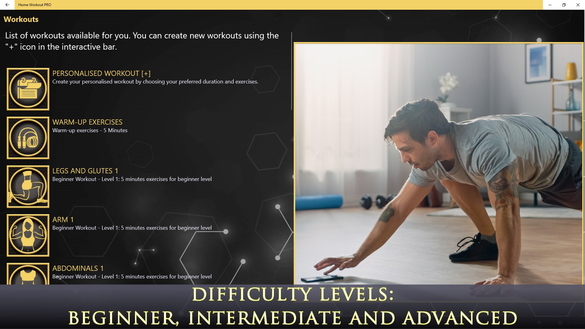 Stay home and stay fit by choosing from three training levels: beginner, intermediate or advanced.