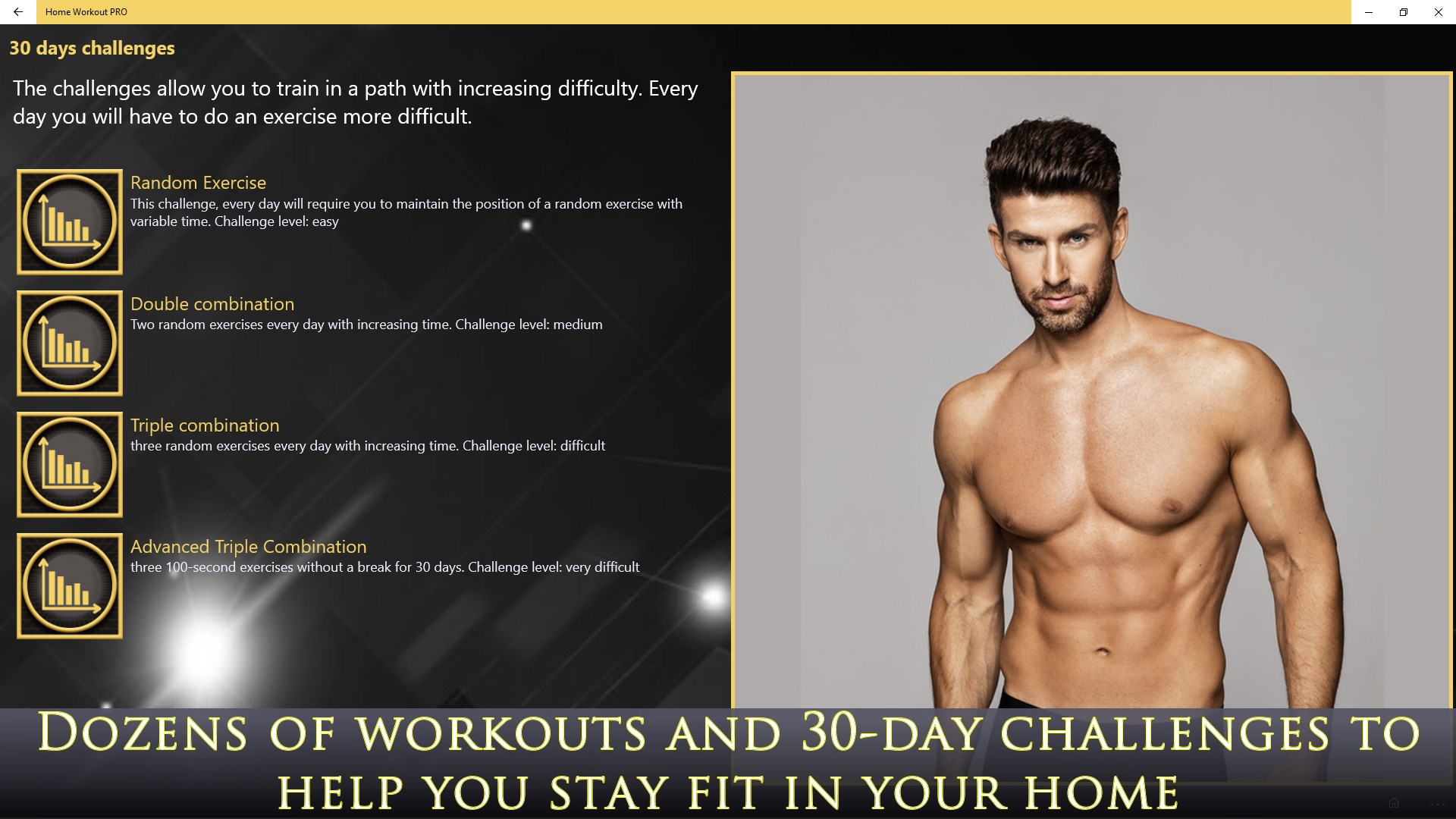 - Dozens of workouts and 30-day challenges to help you stay fit in your home
