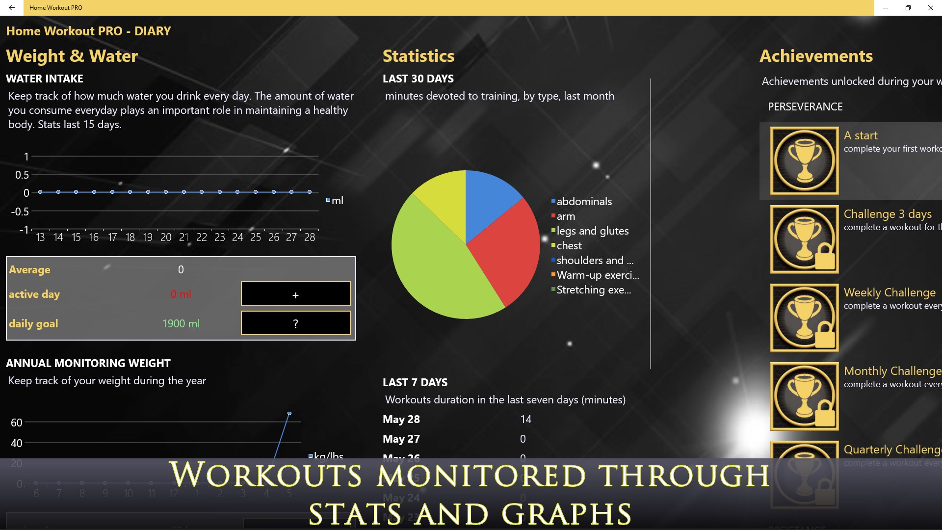 - Workouts monitored through stats and graphs