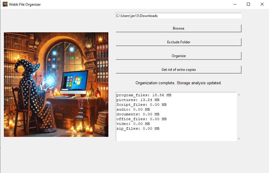 Are you tired of sifting through endless files and duplicates cluttering your system? Say hello to the Webb File Organizer, your new digital efficiency partner! Designed with precision, this tool sorts your files for you into easily managed folders based on file types, eradicates duplicates, and helps you reclaim your digital space effortlessly.