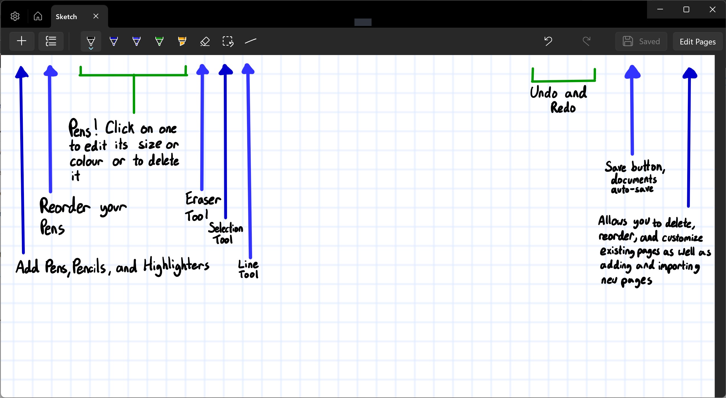 An inbuilt file management system to keep track of your documents within the appPDF Importing and ExportingGrid Paper Page BackgroundCustomizable Pages: change the size and background color Custom Pens: change size, color, and pick from pencils, ballpoints, or highlightersDocument Management: edit pages, remove pages, move pages, insert PDFs