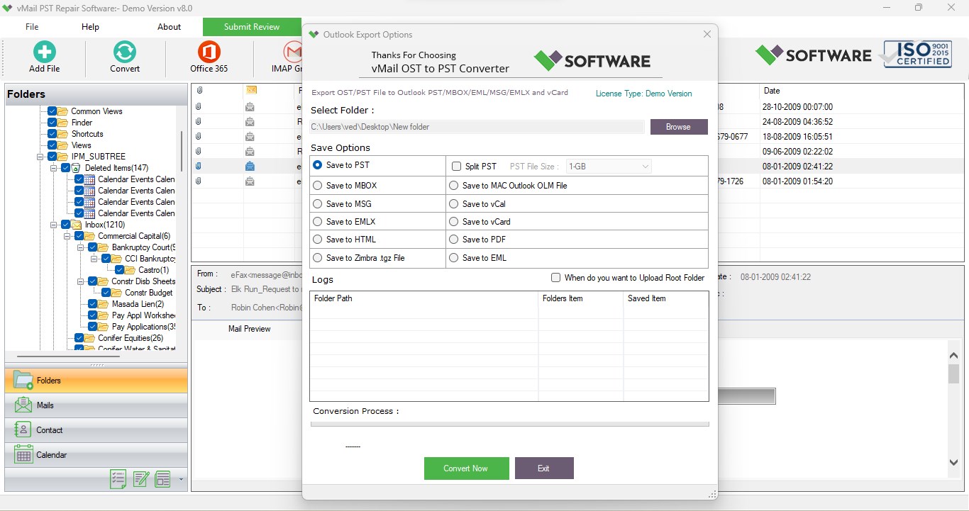 vMail OST to PST Converter Tool can also convert OST file into new healthy PST, EML, EML X, MSG, MBOX, HTML, PDF, card & cal file formats and while maintaining all email meta-data like To, CC, BCC, Subject, Date-Time & email attachments. It's having email migration option to Office 365 account, Gmail / G Suite account & Exchange Server is also available in this software.