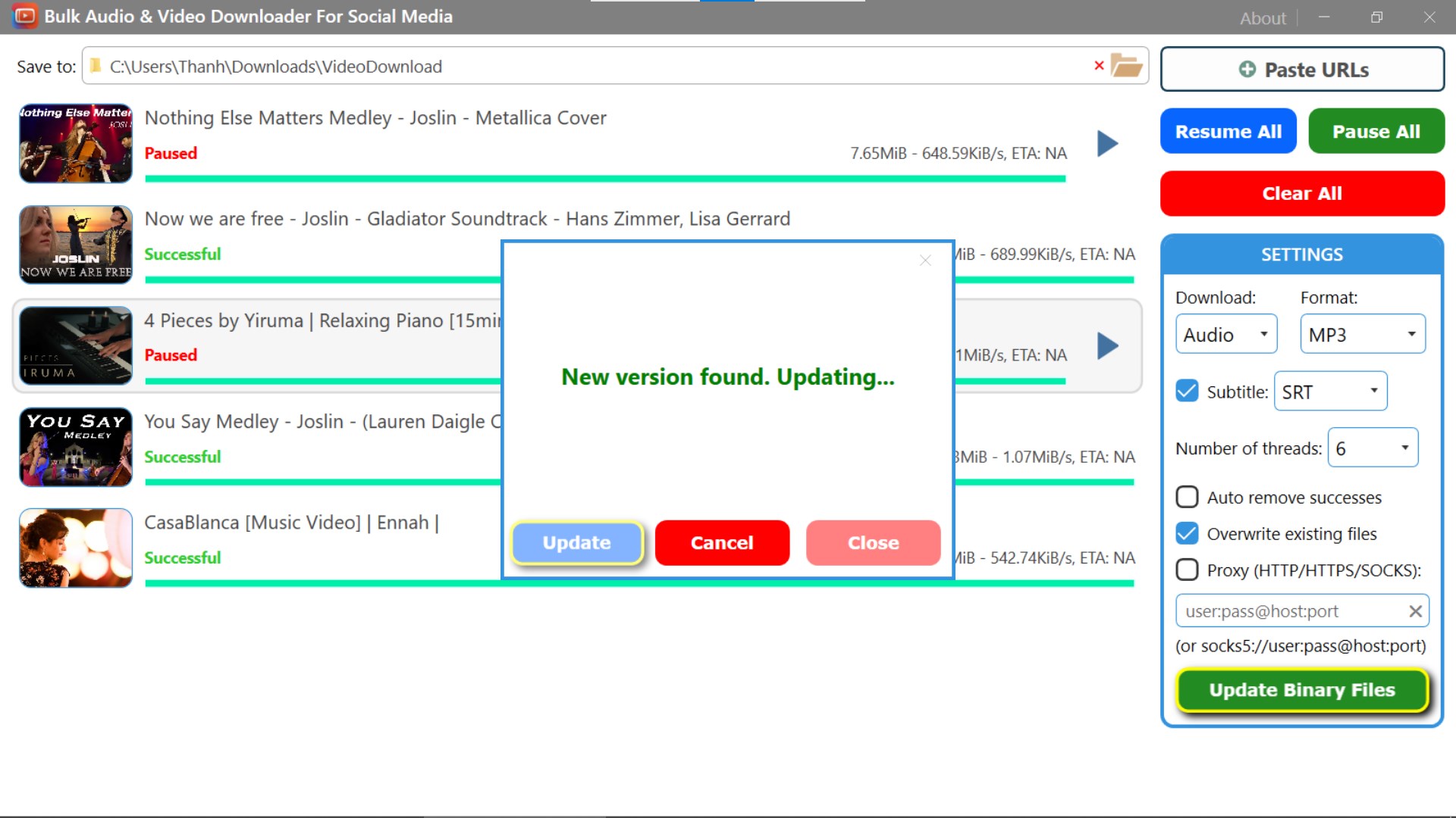 Support multiple social media platforms.Can download Tiktok video without watermark.Download multiple videos/audios in parallel.Default video output format is .mp4. If video does not have mp4 format, the tool will download its available format.Supported audio output formats: .flac, .m4a, .mp3, .opus, .wavCan download subtitles (if available).Support subtitle output formats: .srt, .ass, .lrc, .vttCan pause or resume download tasks any time.Saving settings and download tasks after closing the app.Support proxy protocols: HTTP/HTTPS/SOCKS.