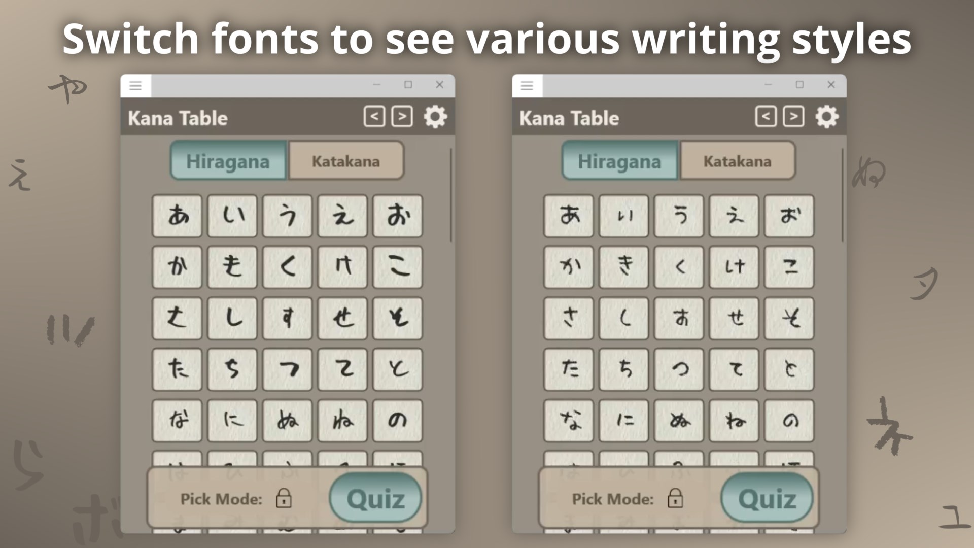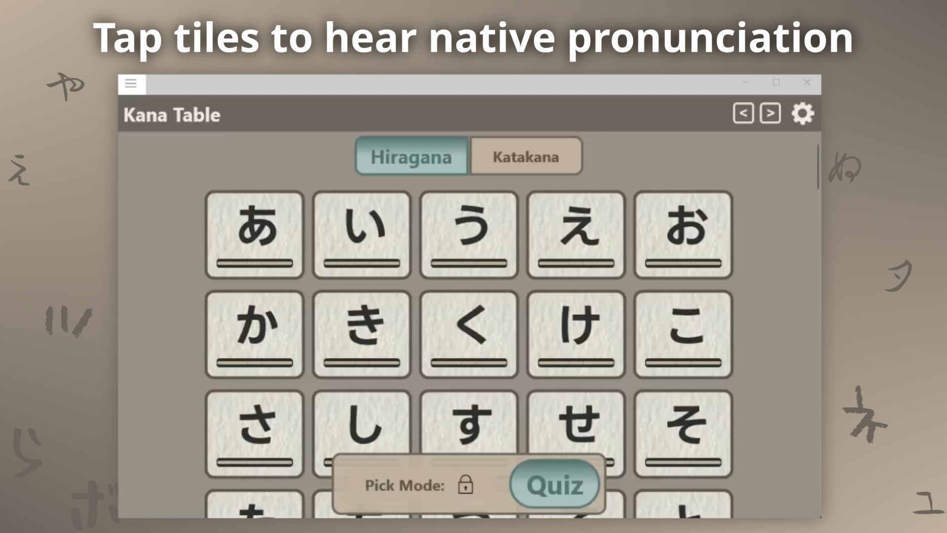 Table of Hiragana and Katakana - tap on the tiles to hear voice pronunciationSwitch fonts to see various writing styles.Quiz mode - practice character recognition.Quiz Statistics are shown on the tiles. Incorrect answers will be repeated more often.