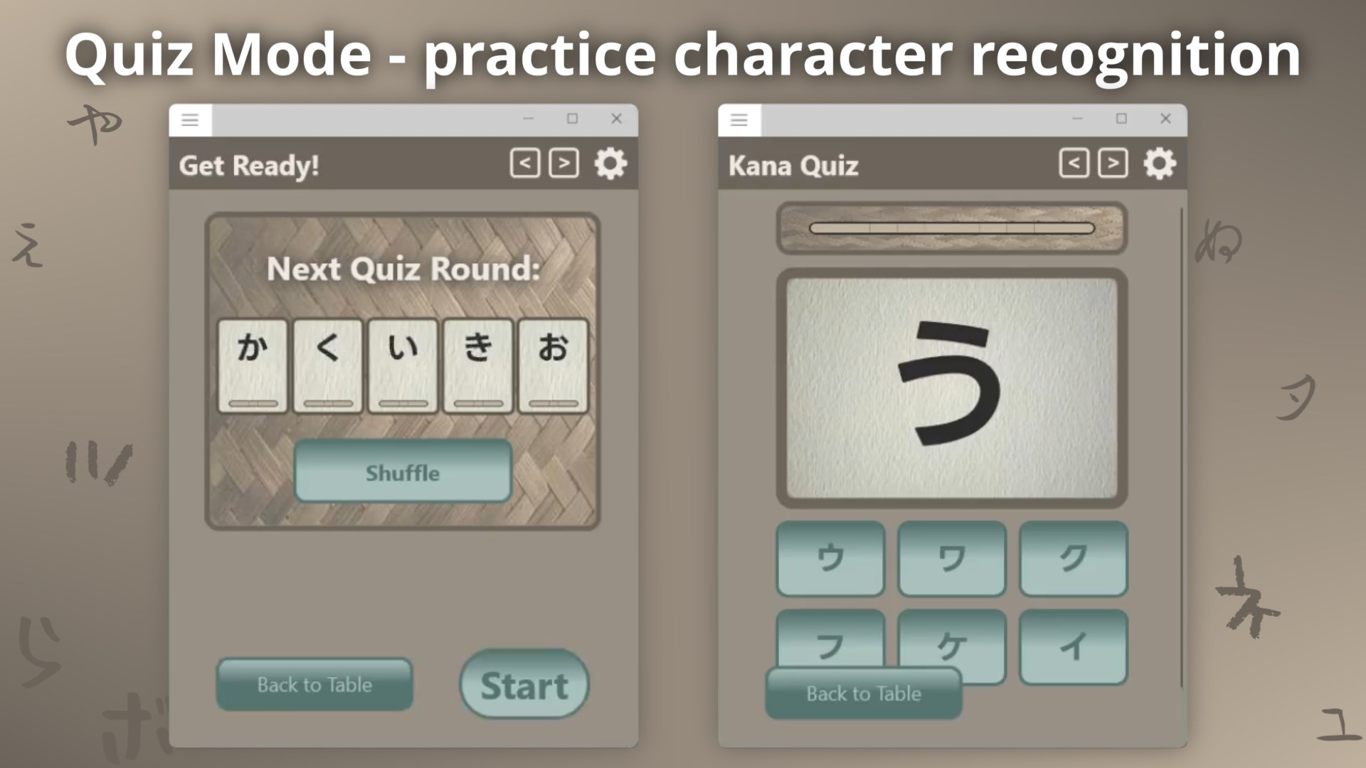 Quiz can be Hiragana => Katakana or Katakana => Hiragana. (or answer in Romaji if you wish)