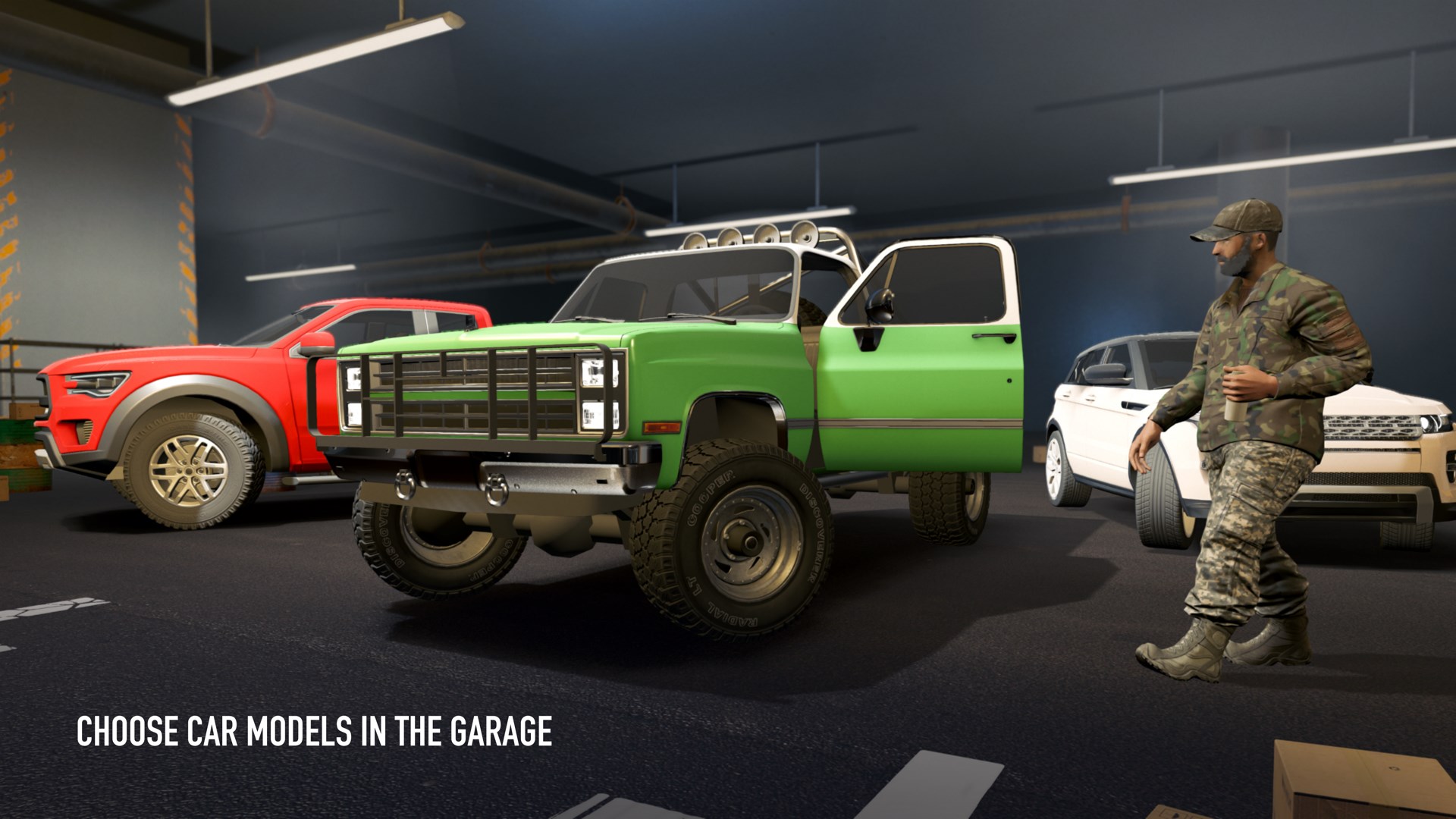 There are several models of off-road cars in the garage, they differ in engine power, clutch strength and gas tank capacity. Choose the one that you like.