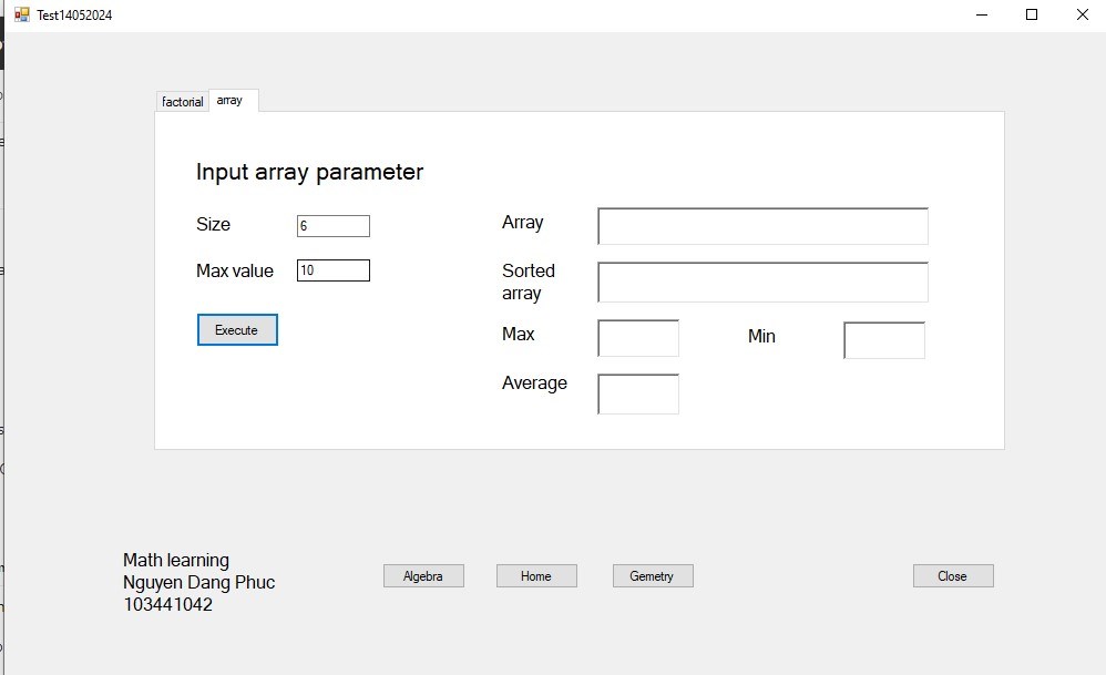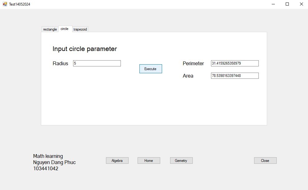 Geometry: help user to caculate perimeter and area of some basic shapesAlgebra: help user to caculate factorial and to work with array