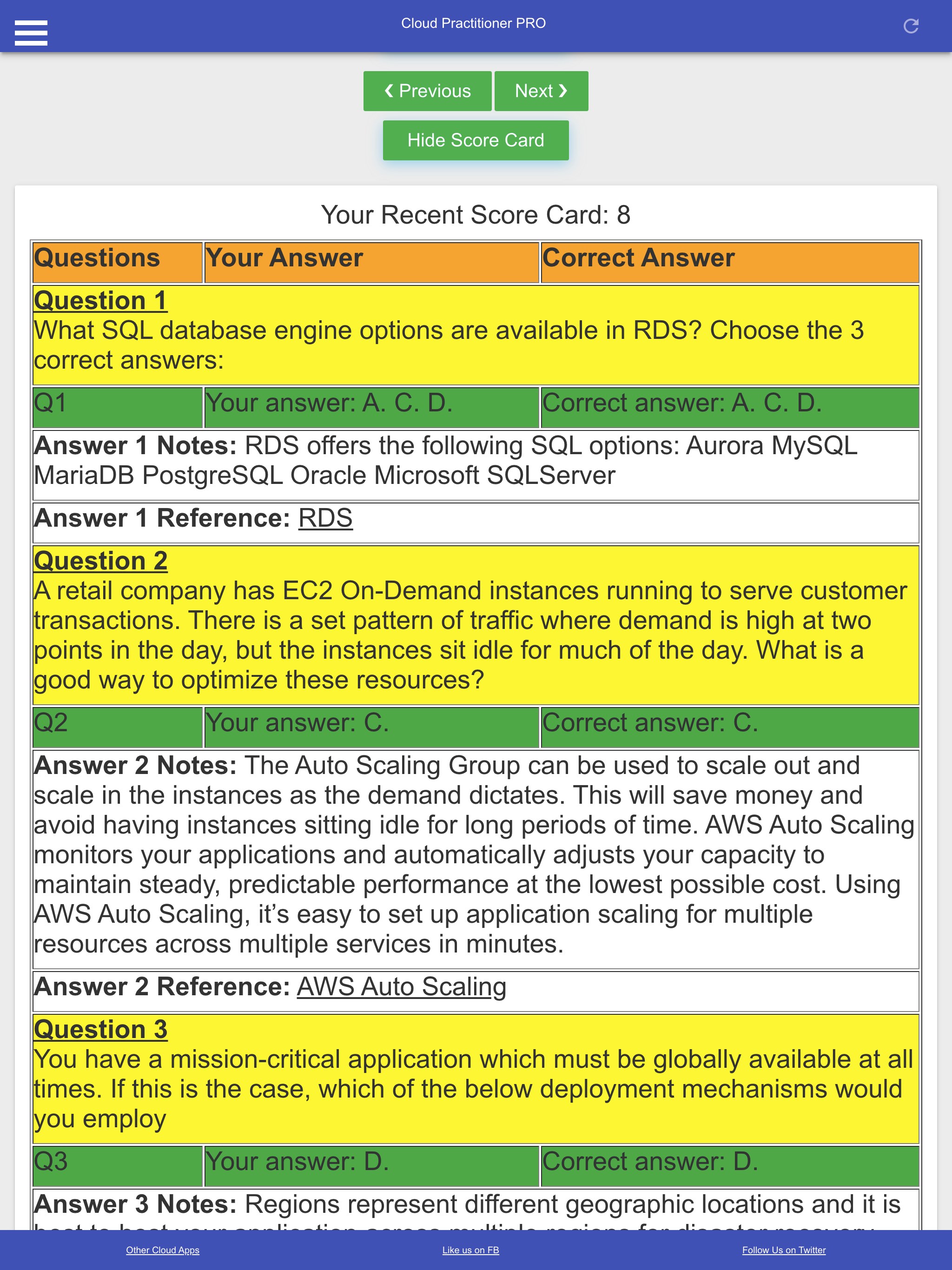 200+ AWS Certified Cloud Practitioner Exam Prep Questions and Answers.Score card, score trackerProgress barCountdown timerSee Answers only after taking QuizShow/hide answers buttonsQuiz with score trackerResource pages with tips to succeed in the examAWS CCP CheatSheetsAWS CCP FlashCardsAWS CCP FAQsAWS Security Best Practices
