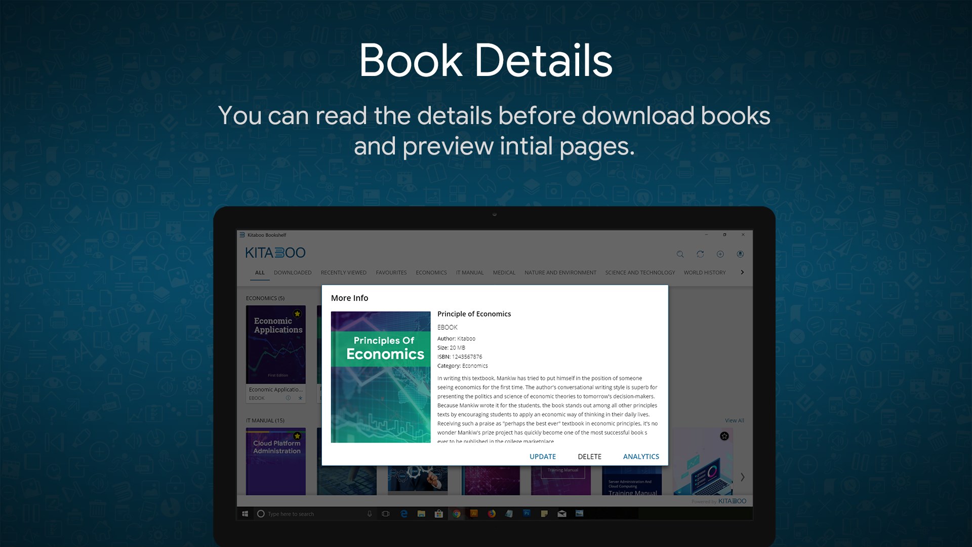 Refreshing eBook Interface.Download your books and access them offline.Amazing Page Rendering - eBooks feel just like the printed books.Portrait and Landscape view with thumbnail based navigation.