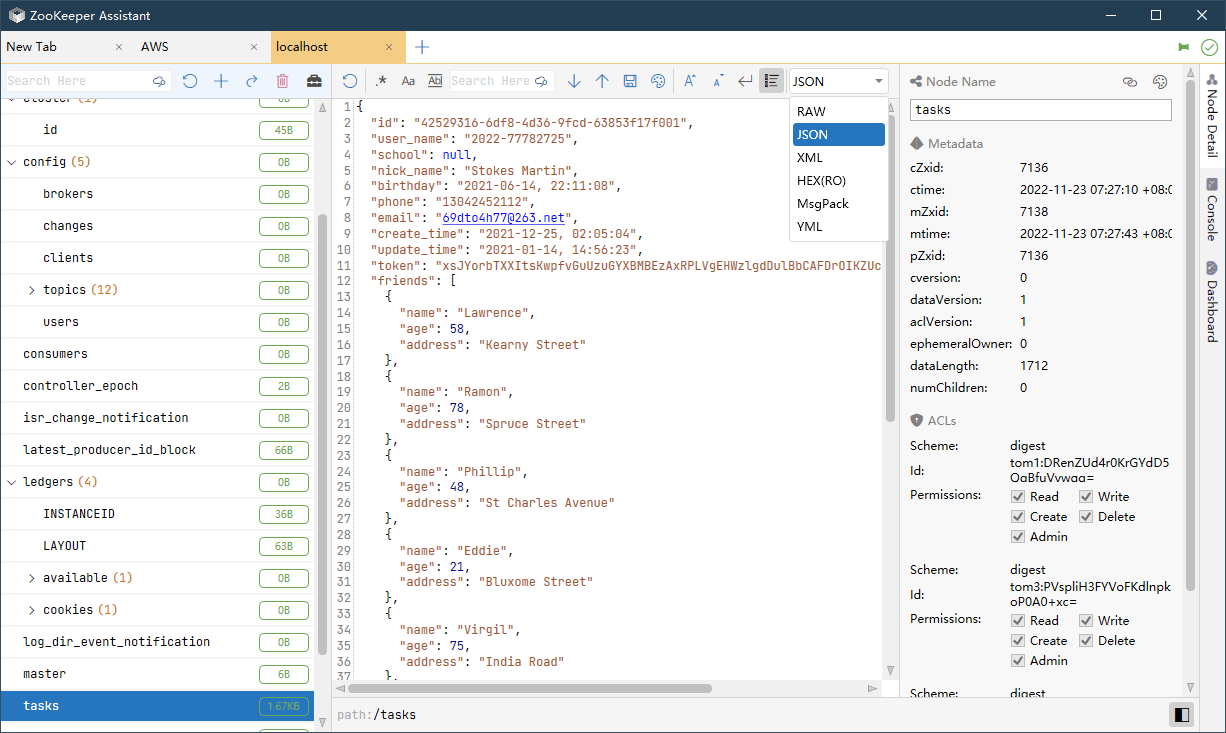 ZooKeeper Visual Management & Monitoring - displaying nodes in a tree structure, monitoring server status, supporting multiple data formats: JSON, XML, HEX, MessagePack.