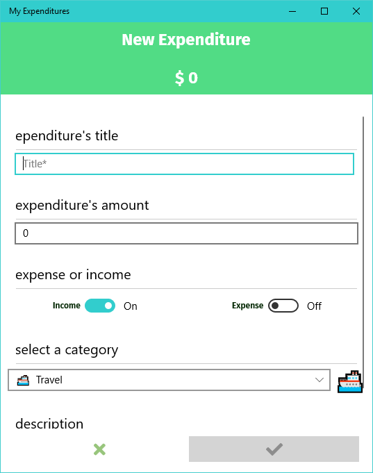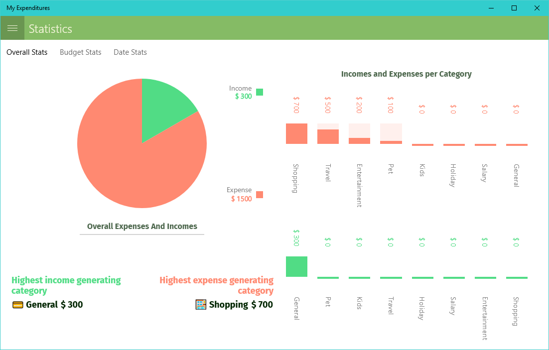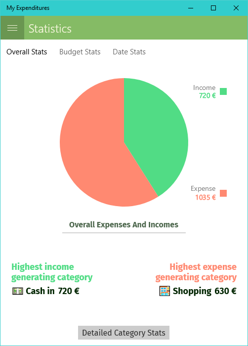 My Expenditures is an application which provides a simple and unique approach to the problem of managing your expenses and incomes. And Optimizing your way of spending your money. Also, by analyzing your expenses and incomes, it will provide statistics on how you spend your money, what you gain or spend the most money on. All these statistics are made available by the application on different criteria which you are free to select (like getting statistics on a given period, or for a given budget). Also, you can get alerted each time you spend your money above a threshold which you determine per budget.