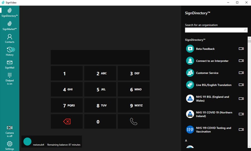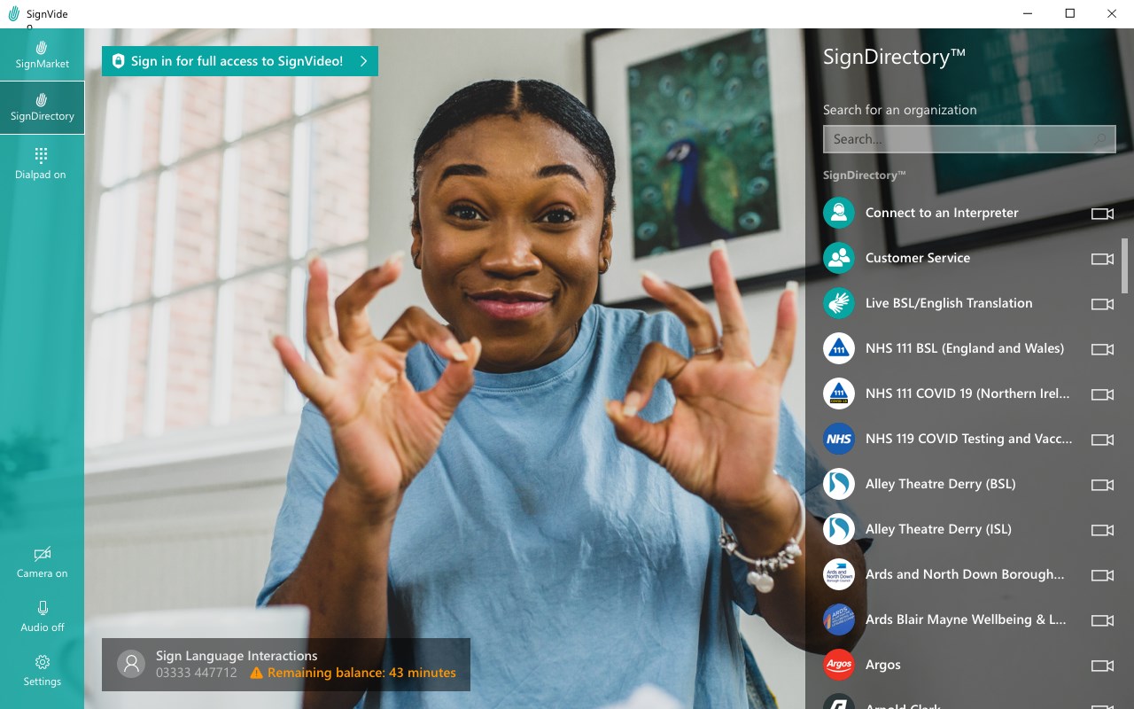 SignDirectory™: List of over 150 services ranging from banks to insurance companies, hospitals to councils and utility companies.SignMarket™: List of BSL owned businesses, call with just one clickSignMail™: Watch video messages from your contacts when you are away from your home or officeContacts: Call any of your contacts with just one clickPeer-to-Peer Calls: Make FREE video calls to another SignVideo customerInterpreter ID: You can see the Interpreter\'s registration number when callingHistory: See incoming, outgoing, and missed callsMinutes Counter: For subscribers, you can see remaining minutes balance