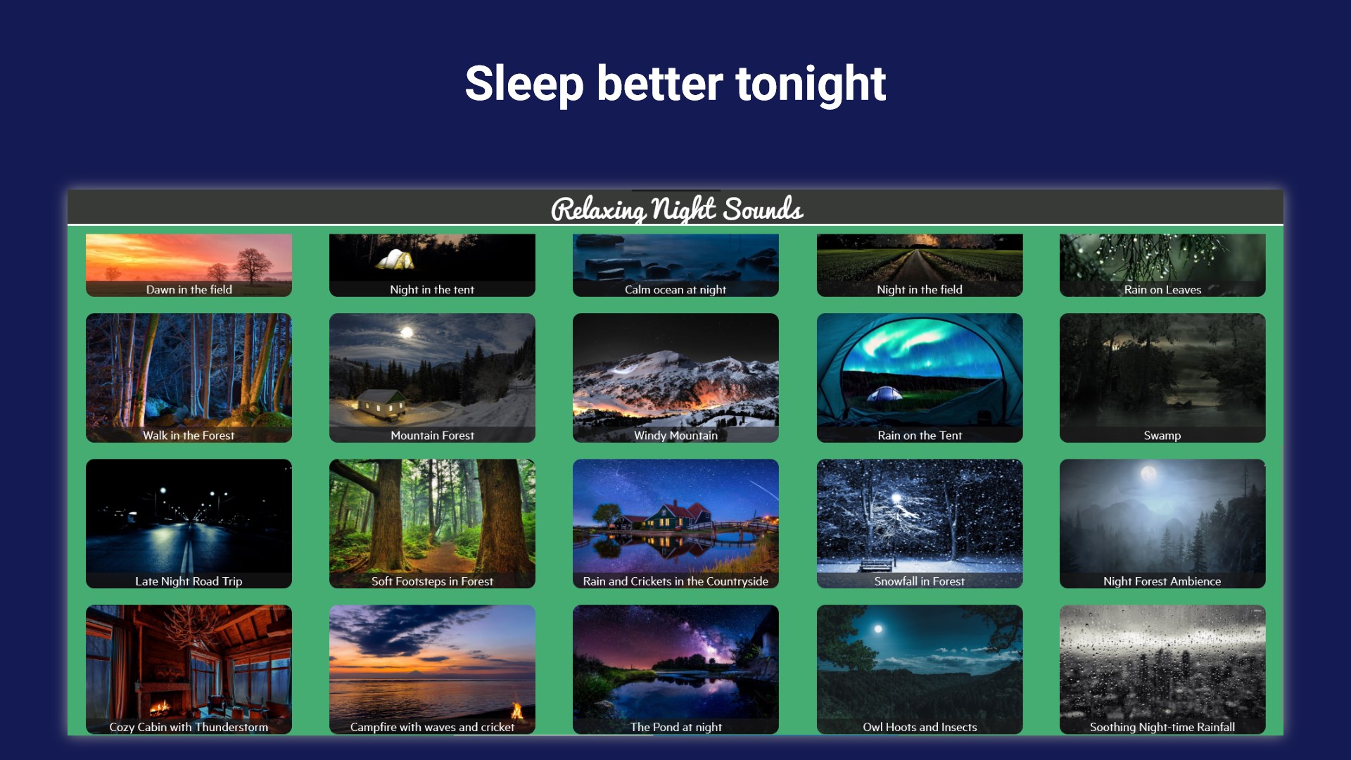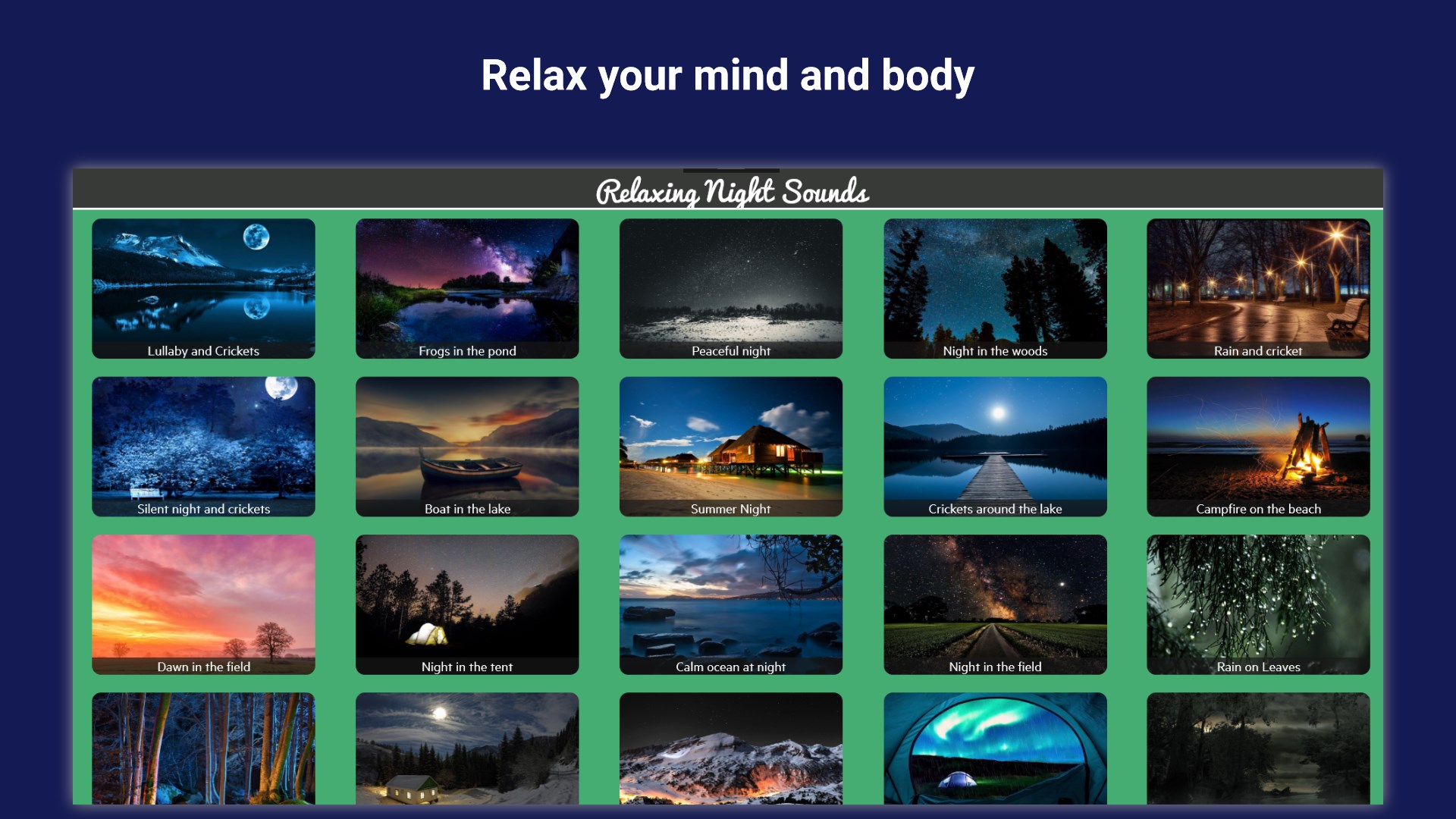 Download "Relaxing Night Sounds" today and discover your favorite nighttime soundscapes. Perfect for relaxation, meditation, sleep, and unwinding, our app offers a diverse collection of ambient night sounds to help you find your peace and tranquility.