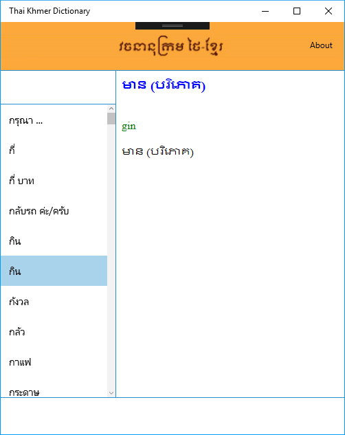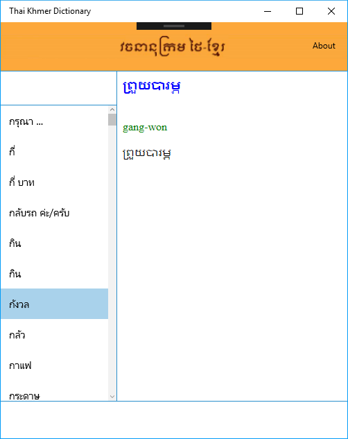 Thai Khmer Dictionary app help you to translate most of common Thai words into Khmer language.