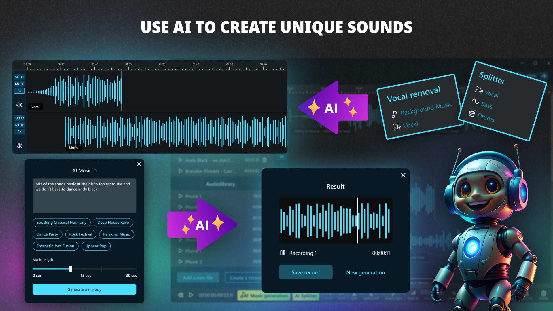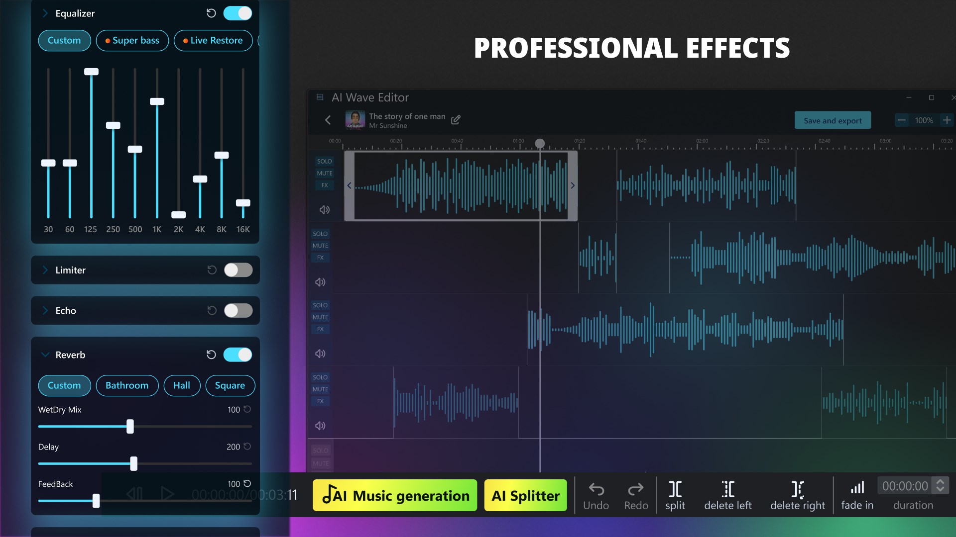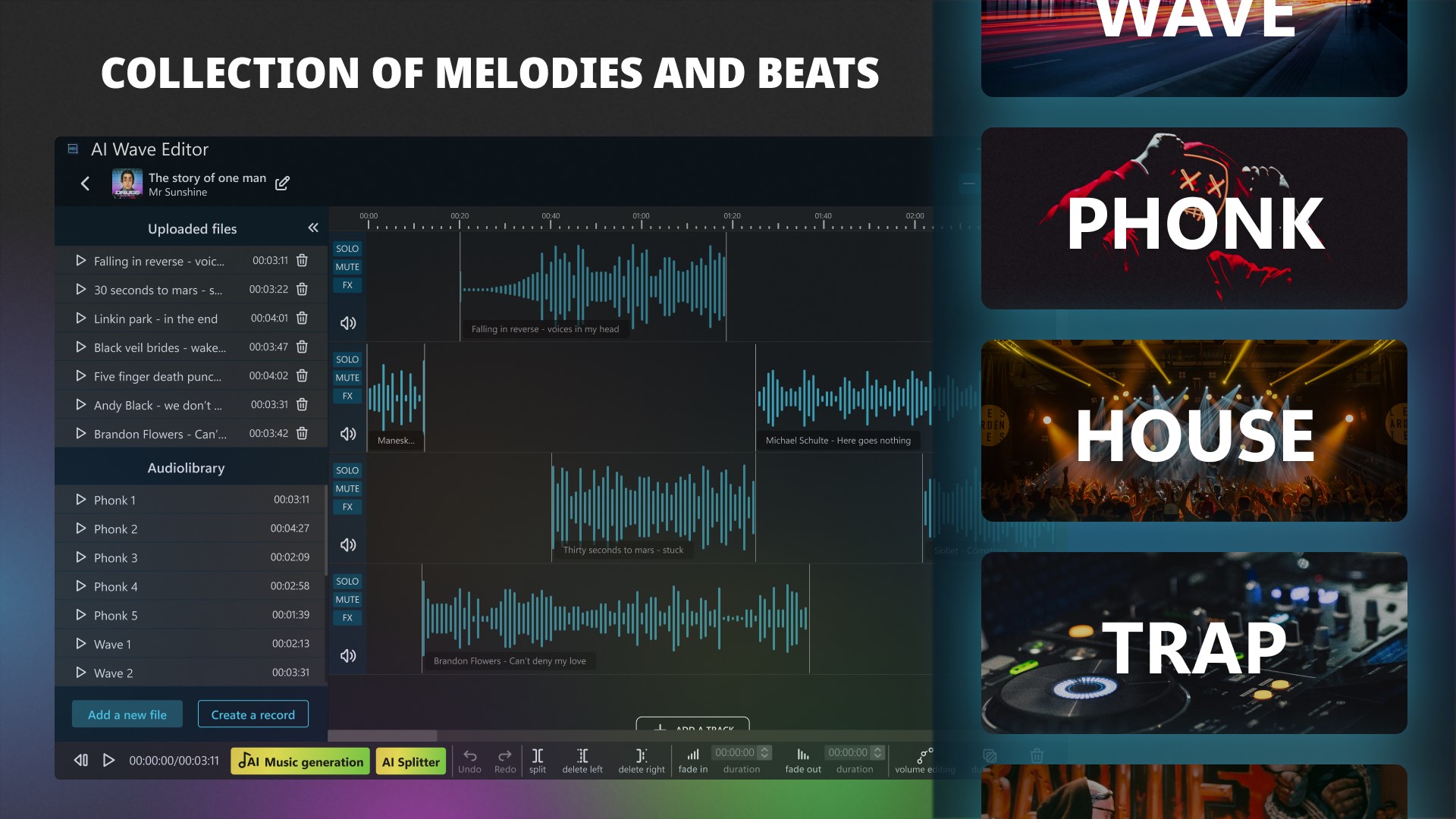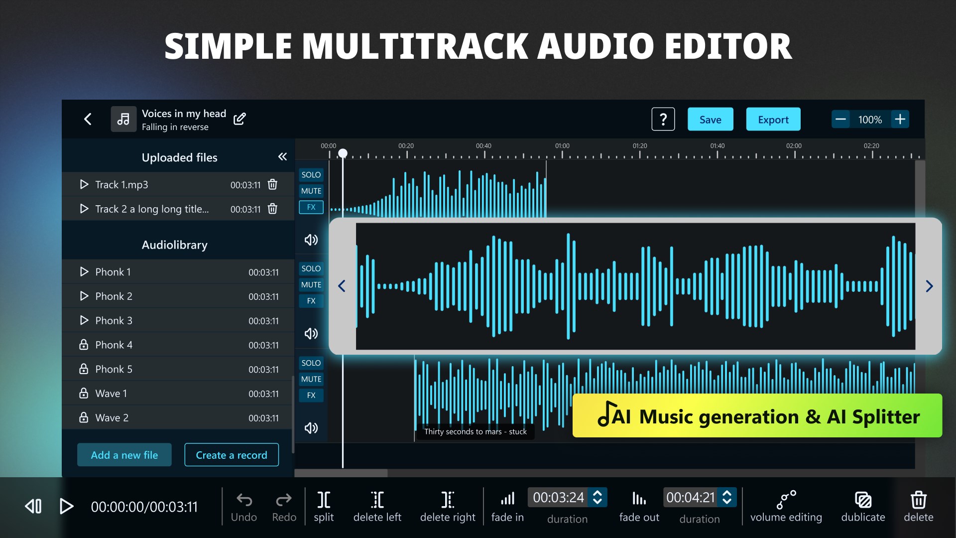 Introducing AI Track Editor, your all-in-one solution for editing audio files of various formats with seamless application of effects, filters, and transitions, all with the help of cutting-edge AI technology. Whether you're a professional sound engineer or a beginner in the world of audio editing, AI Track Editor provides a comprehensive set of tools to transform your audio projects.