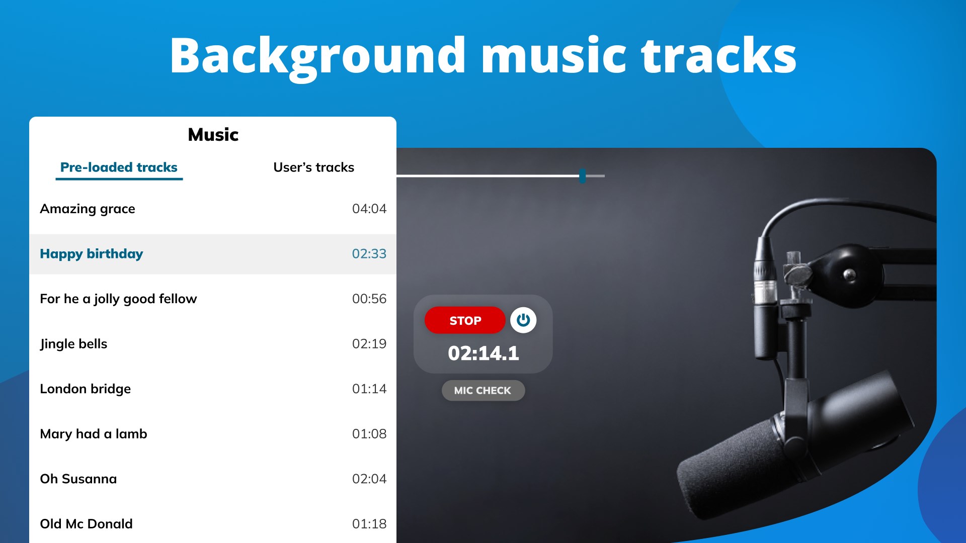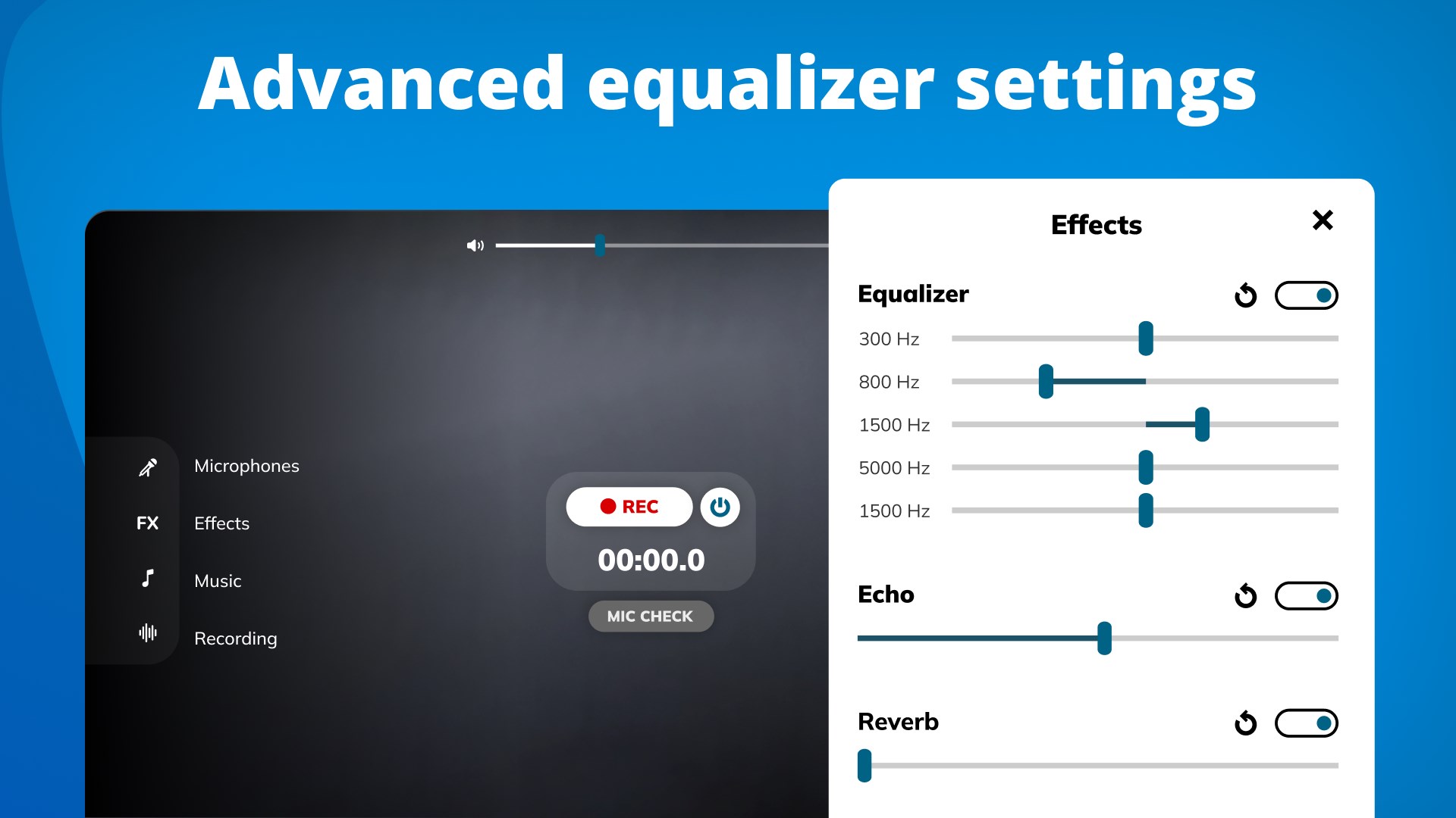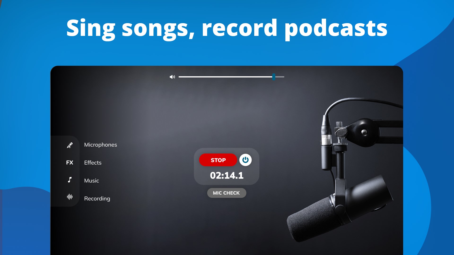 Apply different effects to add more variety to the sound - make your voice sound spacey and lush, or more dry and calm. Add your own music tracks and play them in the background during streams. Save the recording you made and publish or share it in the web! The app offers such features, including, but limited to, gain control, automatic recording, sound effects, equalizer presets, mic check.