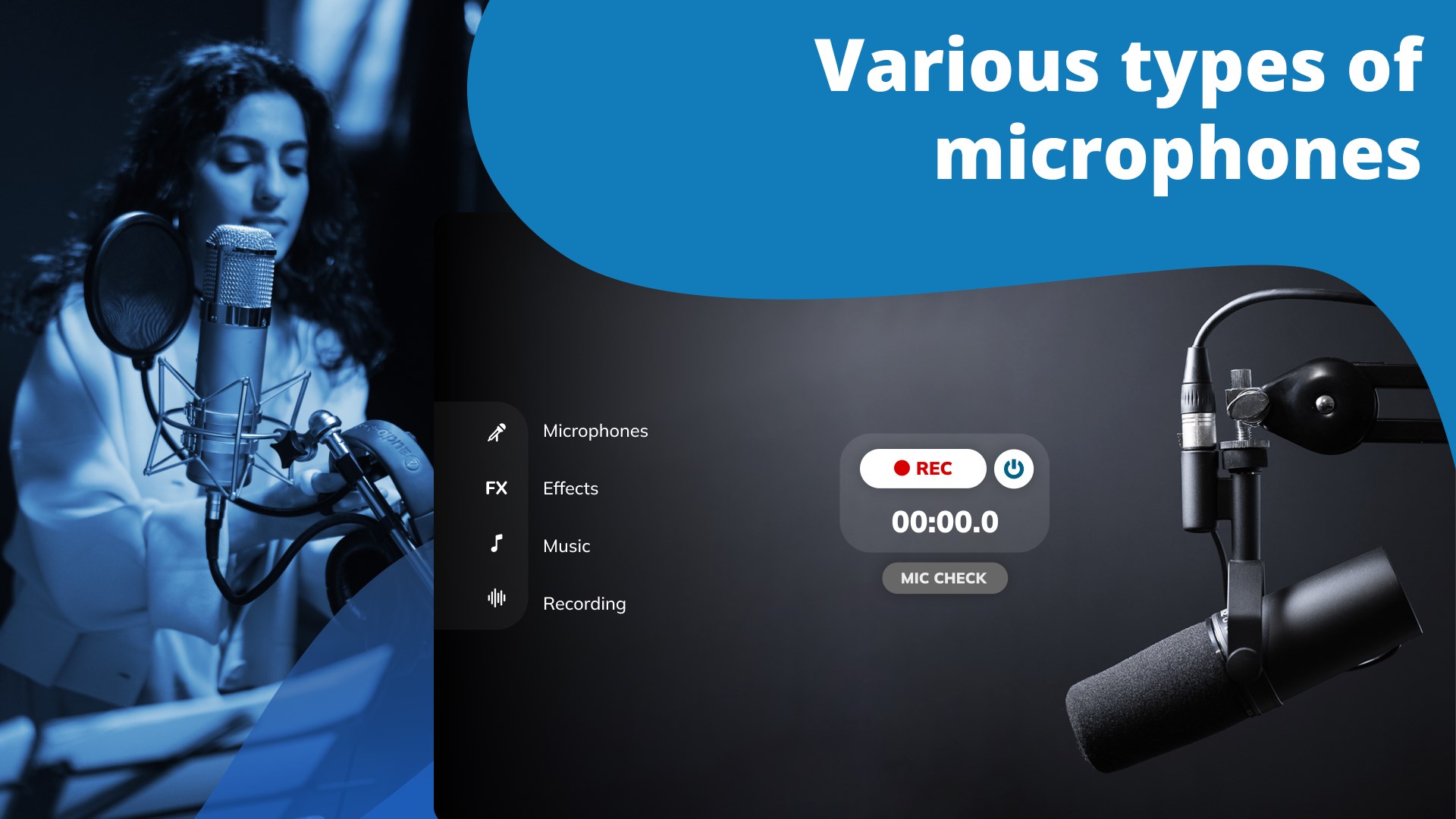 Make your voice sound better for any public occasion - from singing karaoke to giving a speech - with Singing Microphone your task will become much more enjoyable. Choose between different microphone presets to recreate the authentic and recognisable sounds of concert mics, vintage mics, radio mics and more.