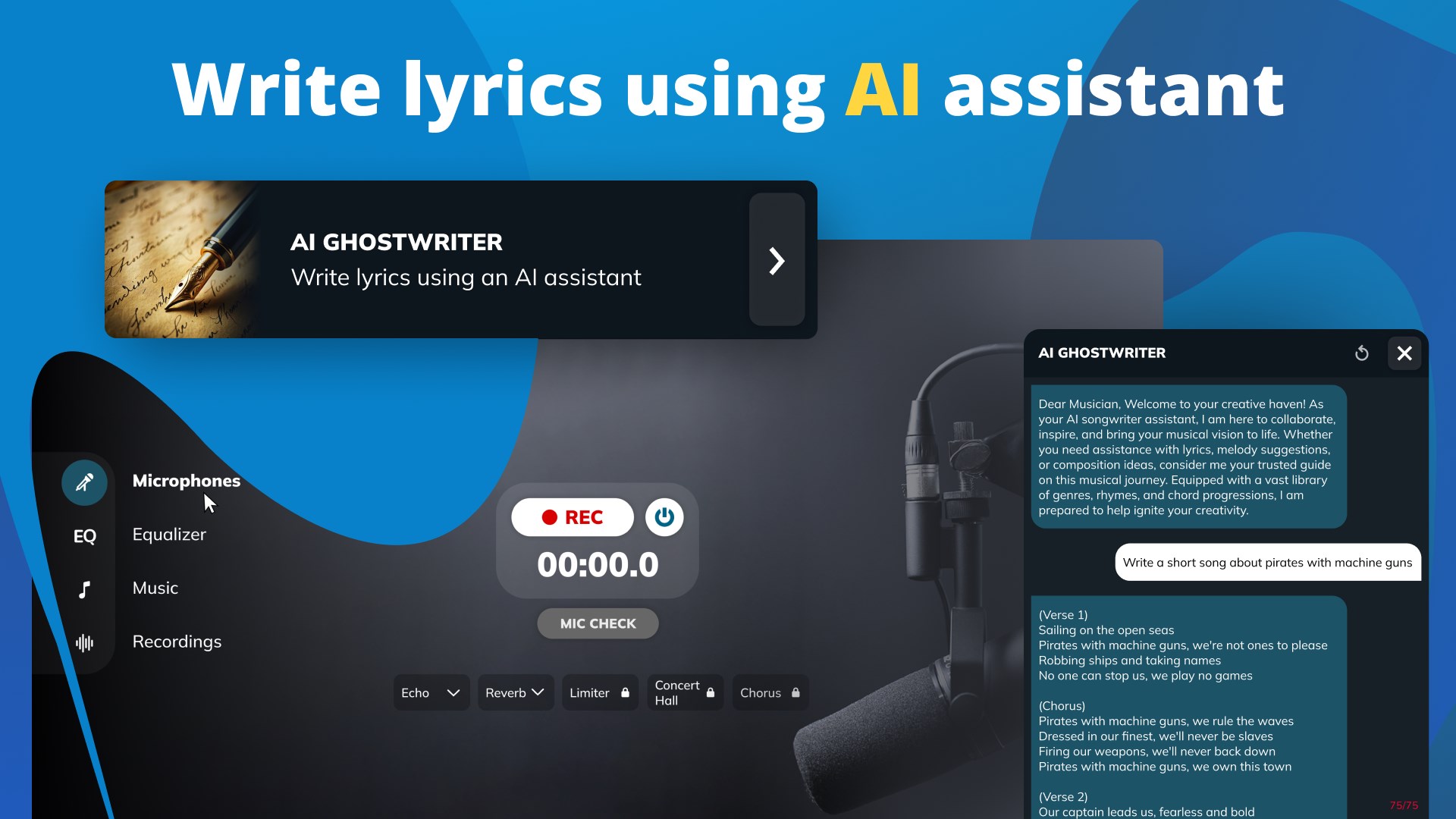 The AI assistant feature will provide you with unlimited opportunities for creativity - generate unique song lyrics on any topic. Take the first step towards creating and recording your own song!