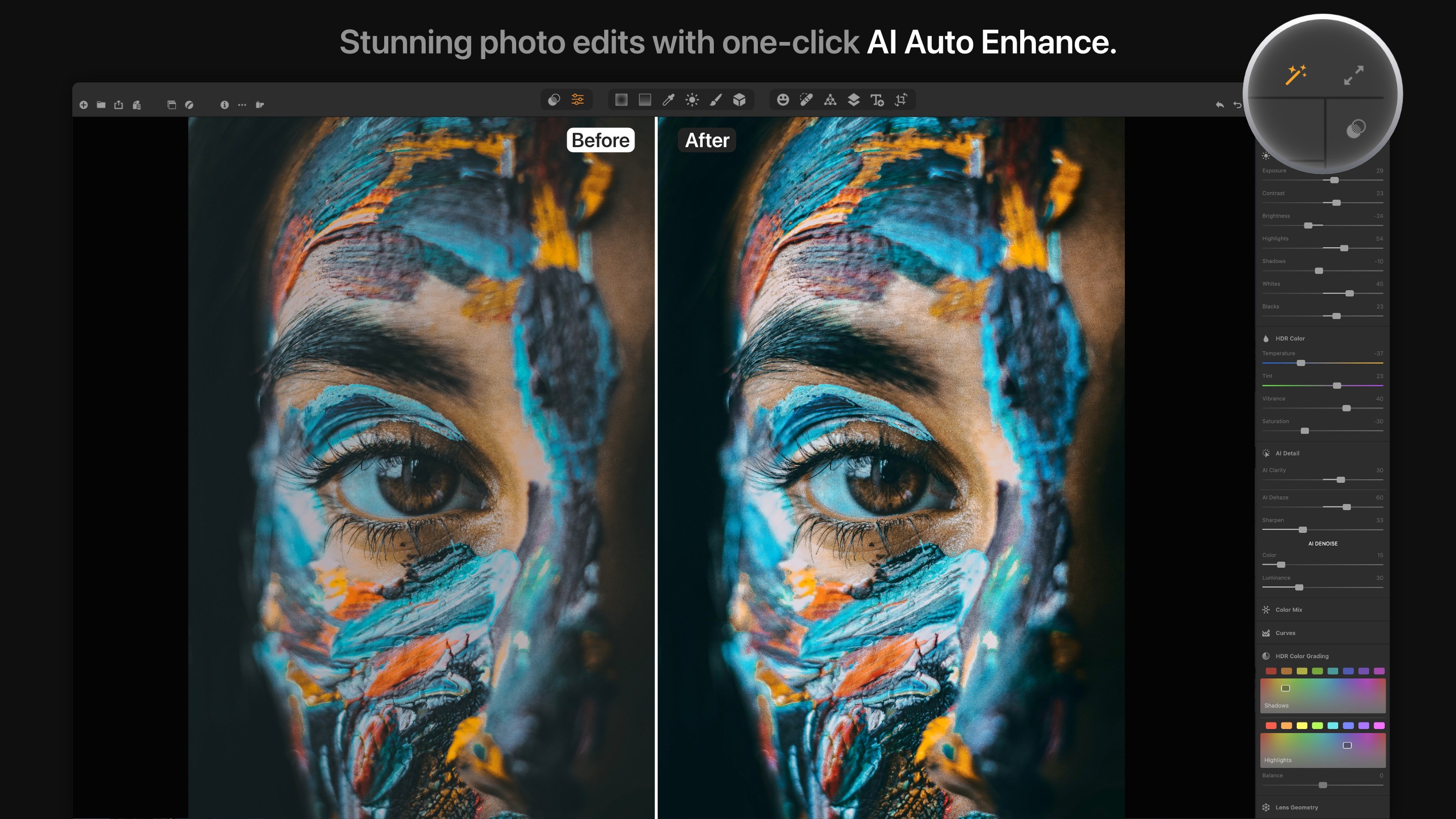 β’ AI Auto Enhance - Professional-style automatic editing with one touch. The Irix HDR Voxell AI engine is trained on over 12 million images and applies proven photographic techniques to enhance your photos.