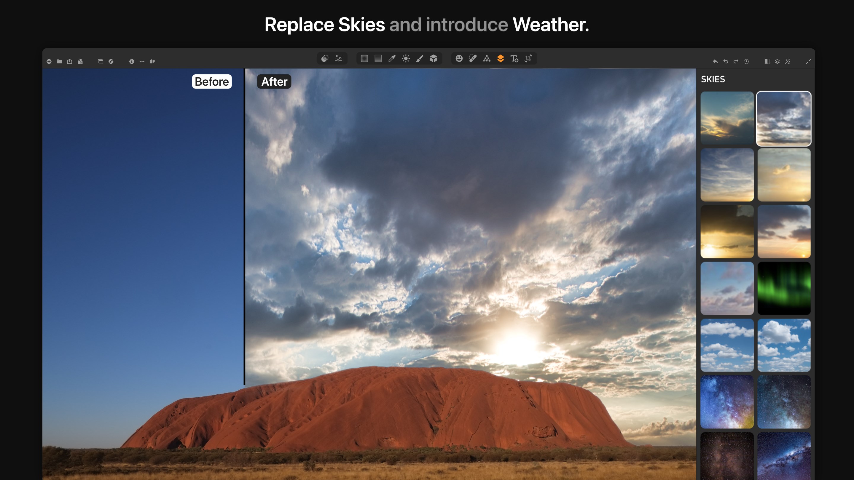 β’ Sky replacement (SkyXpress) - replace the sky and enter the weather. Import custom skies and merge, blend, integrate with your image for a natural look with AI Edge Detect.